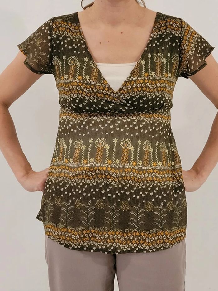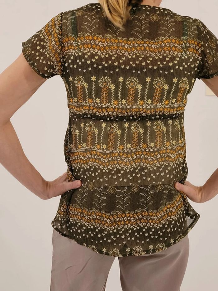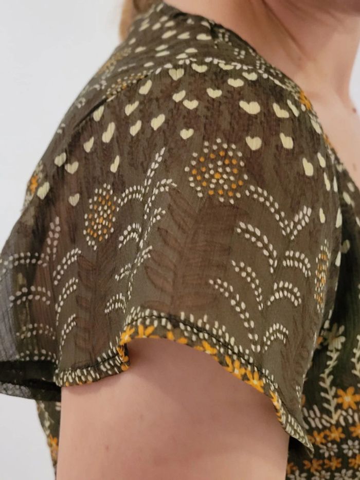 Blouse en voilage kaki, imprimé fleuri et coeur ton de vert anis, écru, orange. N hésitez pas à découvrir les autres articles de mon dressing! 😉