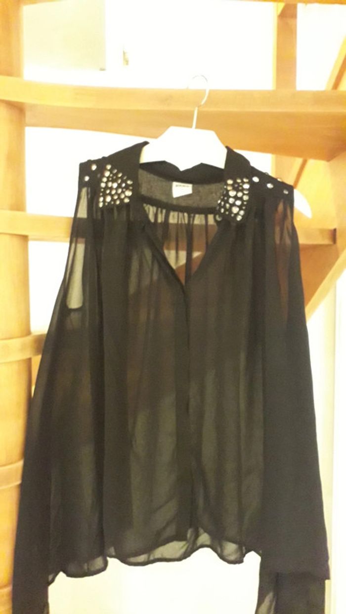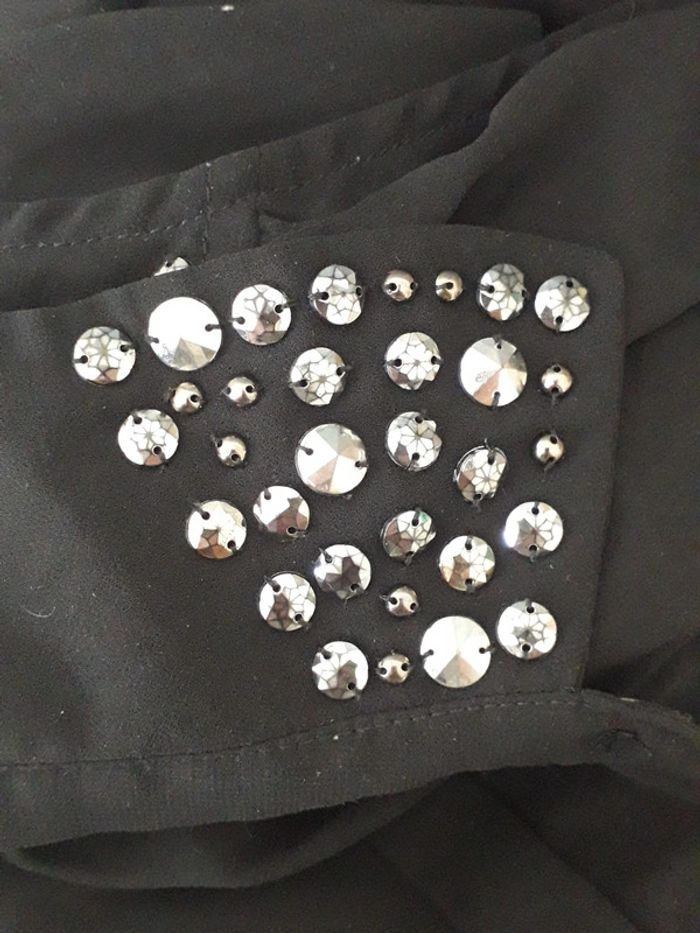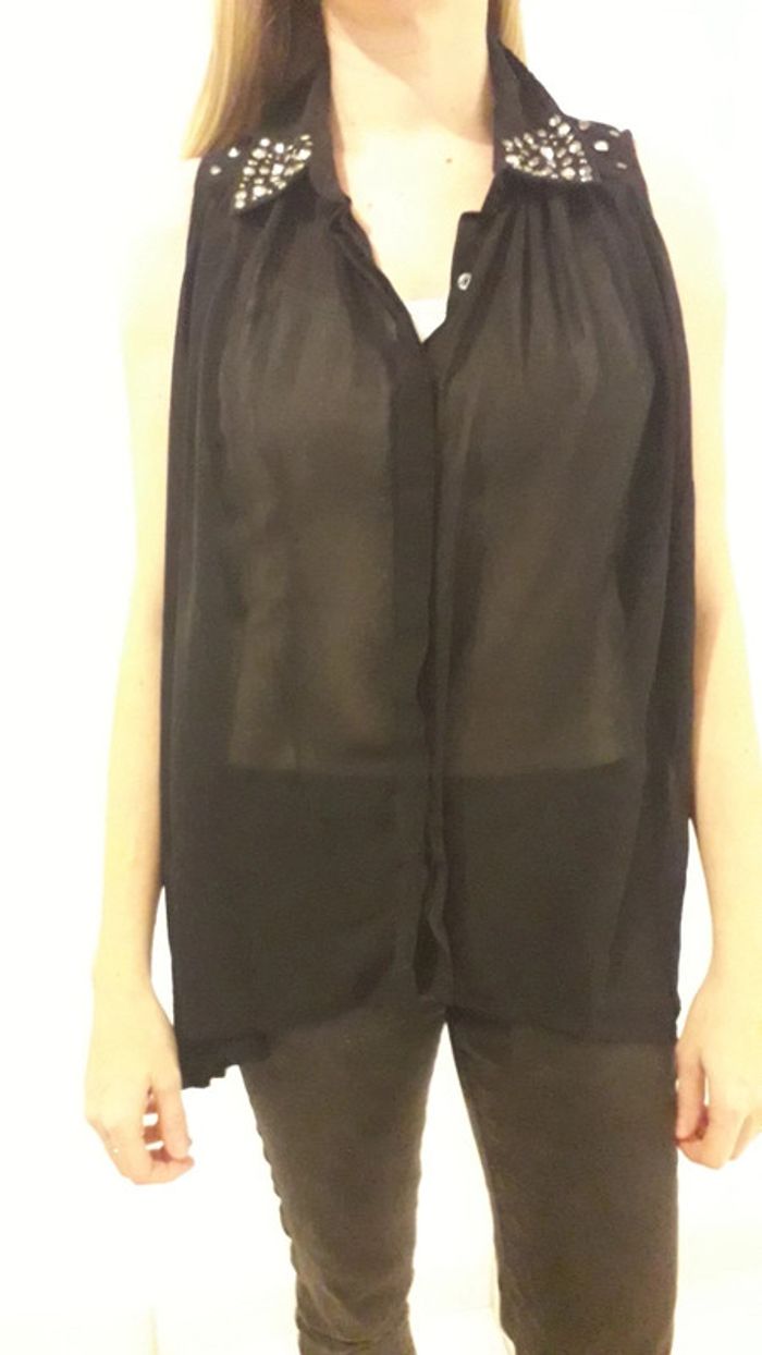 Chemise sans manches noire en voilage. Travail de sequin sur le col. Coupe plus longue sur les côtés. Taille S/M équivaut à un 38/40.