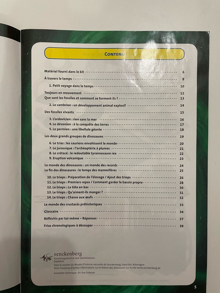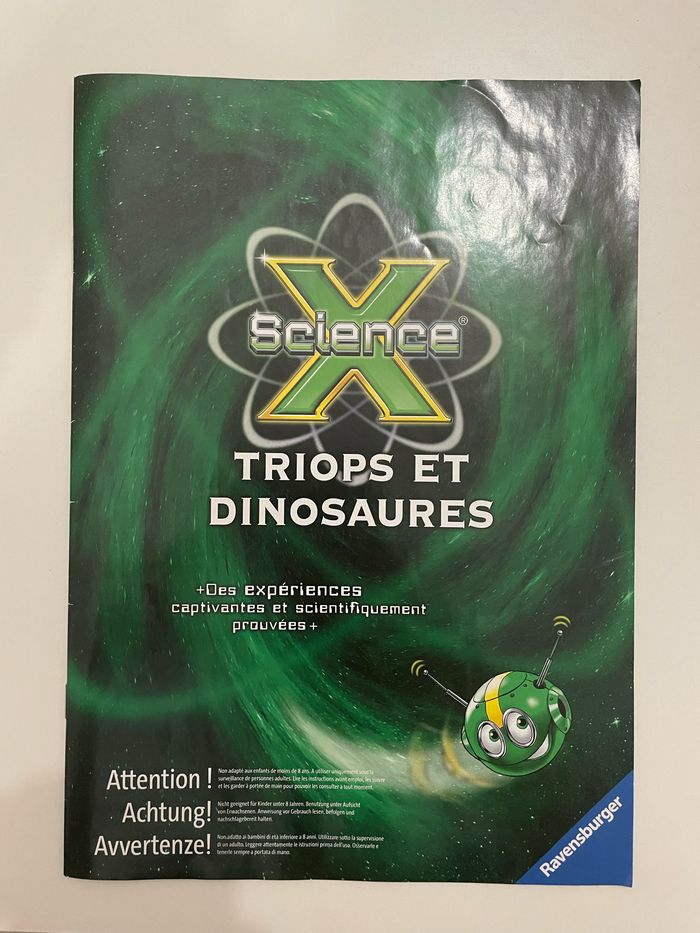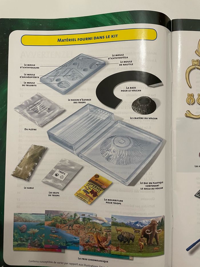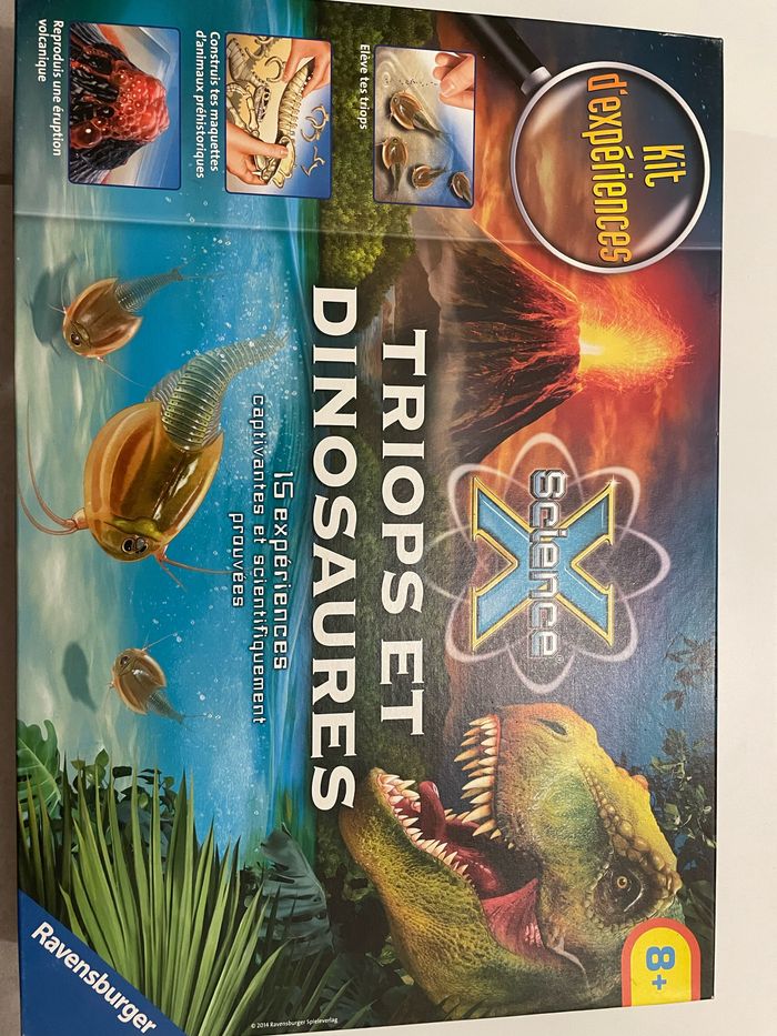 Bonjour je vend ce kit d’expérience de triops et dinosaures. Ce kit est en état parfait et n’a été utilisé qu’une seul fois. Le sachet de plâtre est entamé mais il en reste assez pour refaire une expérience. Aucun défaut et aucun dégât sur aucune pièce. Ce kit comporte: LE MOULE D'ICHTHYOSTÉGA LE MOULE DE NAUTILE LE MOULE D'ICHTHYOSAURE LE MOULE D'ARCHÉOPTÉRYX® LE MOULE DE TRILOBITE LA BASE POUR LE VOLCAN LE BASSIN D'ÉLEVAGE DES TRIOPS LE CRATÈRE DU VOLCAN DU PLÂTRE( sachet ouvert, bien refermé et réutilisable) LES TRIOPS LE SABLE MINI GRANULAT LE BAC EN PLASTIQUE CONTENANT LE SOCLE DU VOLCAN MAQUETTE DE TYRANNOSAURE REX LES PASTILLES DE COULEUR LE THERMOMÈTRE LA LIBELLULE GÉANTE MEGANEURA EN CARTON Et…… Une loupe !!!!