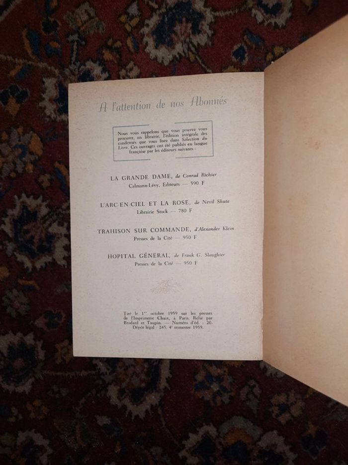 Conrad Richter, la grande dame Nevil Shute, l'arc en ciel et la rose Alexander Klein, trahison sur commande Frank G. Slaughter, hôpital général Édition 1959 Bon état, voir photos #sevakk22_livre