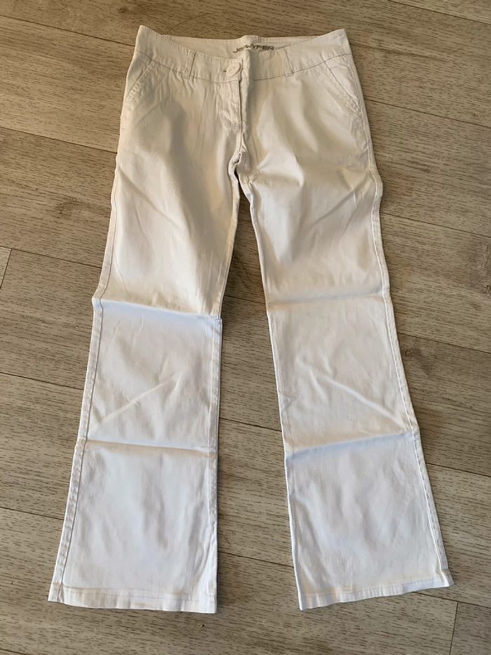 pantalon blanc jenyfer forme évasée en très bon état, bien blanc un micro tache au niveau d’une jambe et un petit défaut montrés en photo #joshanafemme