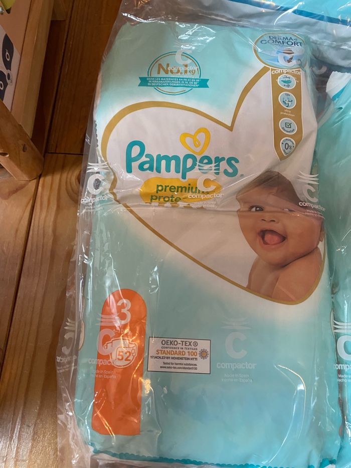 2 paquets ouverts (un avec 42 couches et l’autre avec 29 couches) taille 3, Pampers premium.