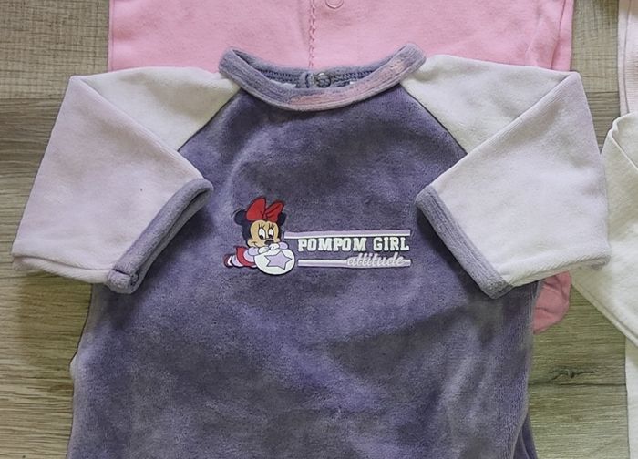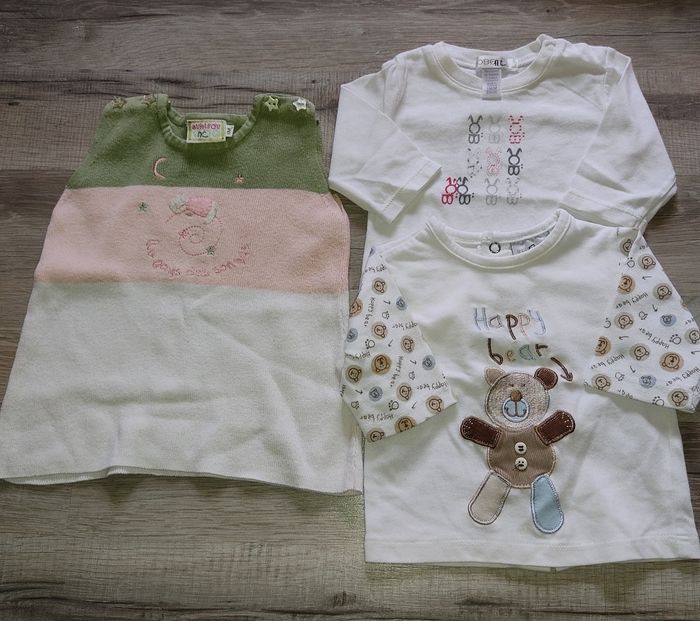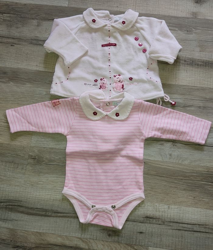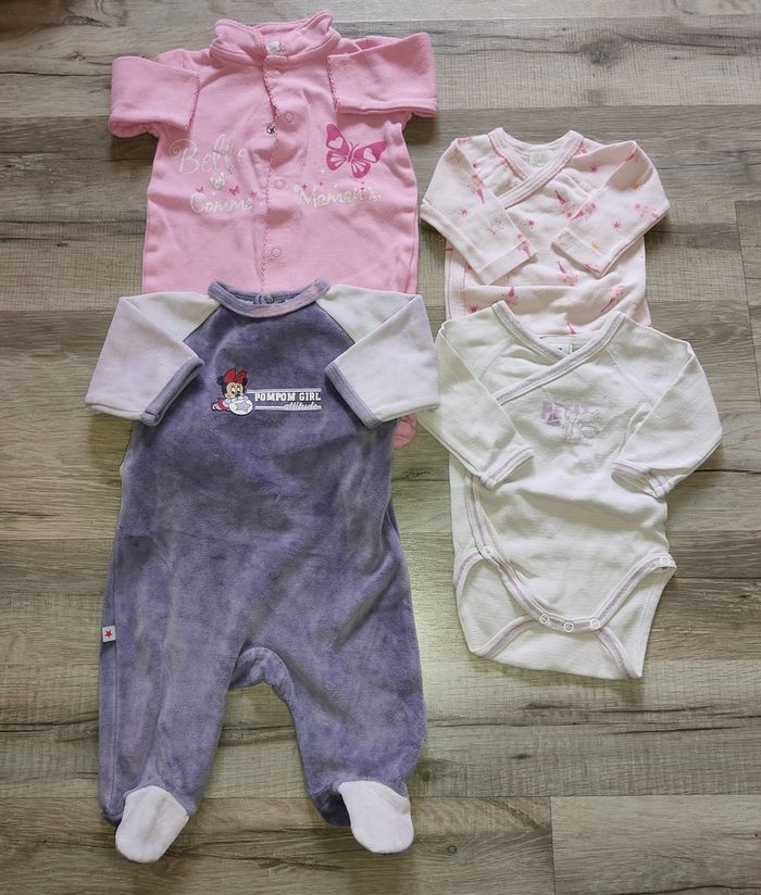 Vend ce lot fille taille 1 mois composé 2 pyjamas, 2 bodies manches longues, un ensemble body+pull, une robe et 2 tee-shirts manches longues. ATTENTION le prix est bas car le col d'un des pyjamas est délavé (voir photo) et les vêtements ont beaucoup servis. Différentes marques.