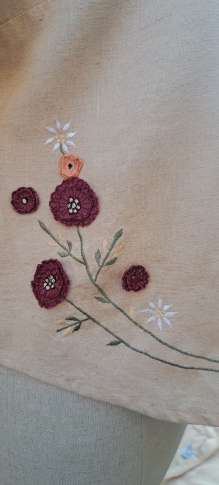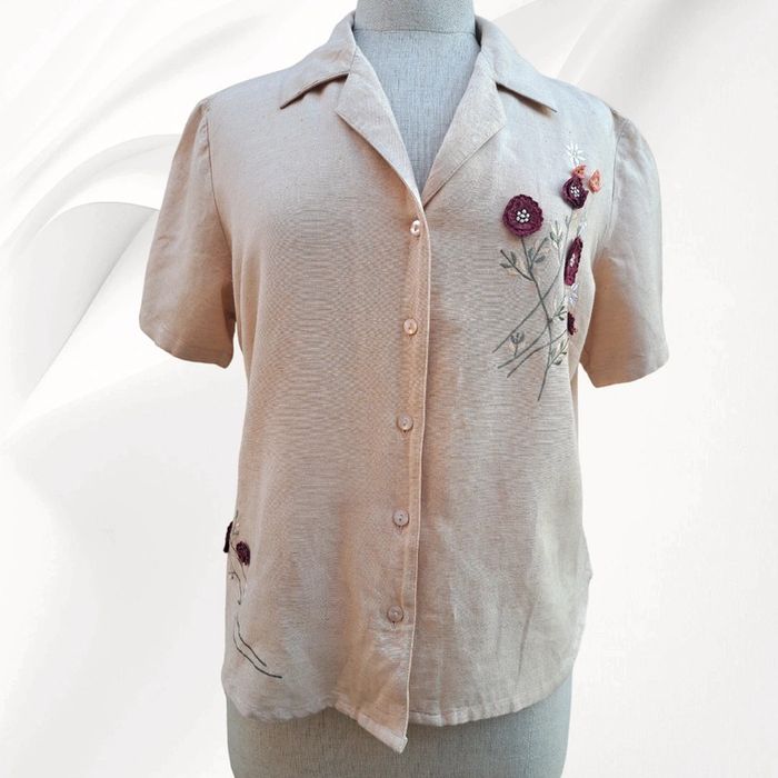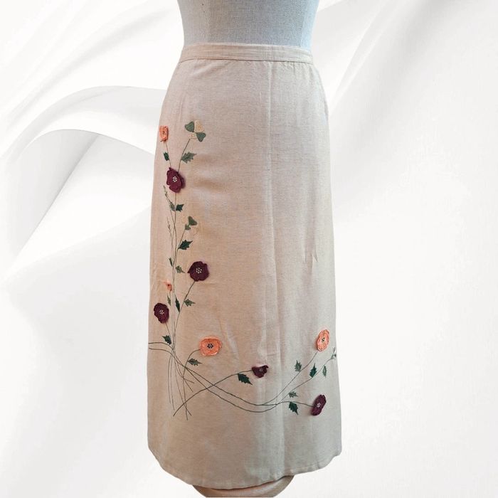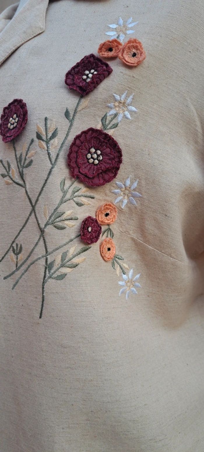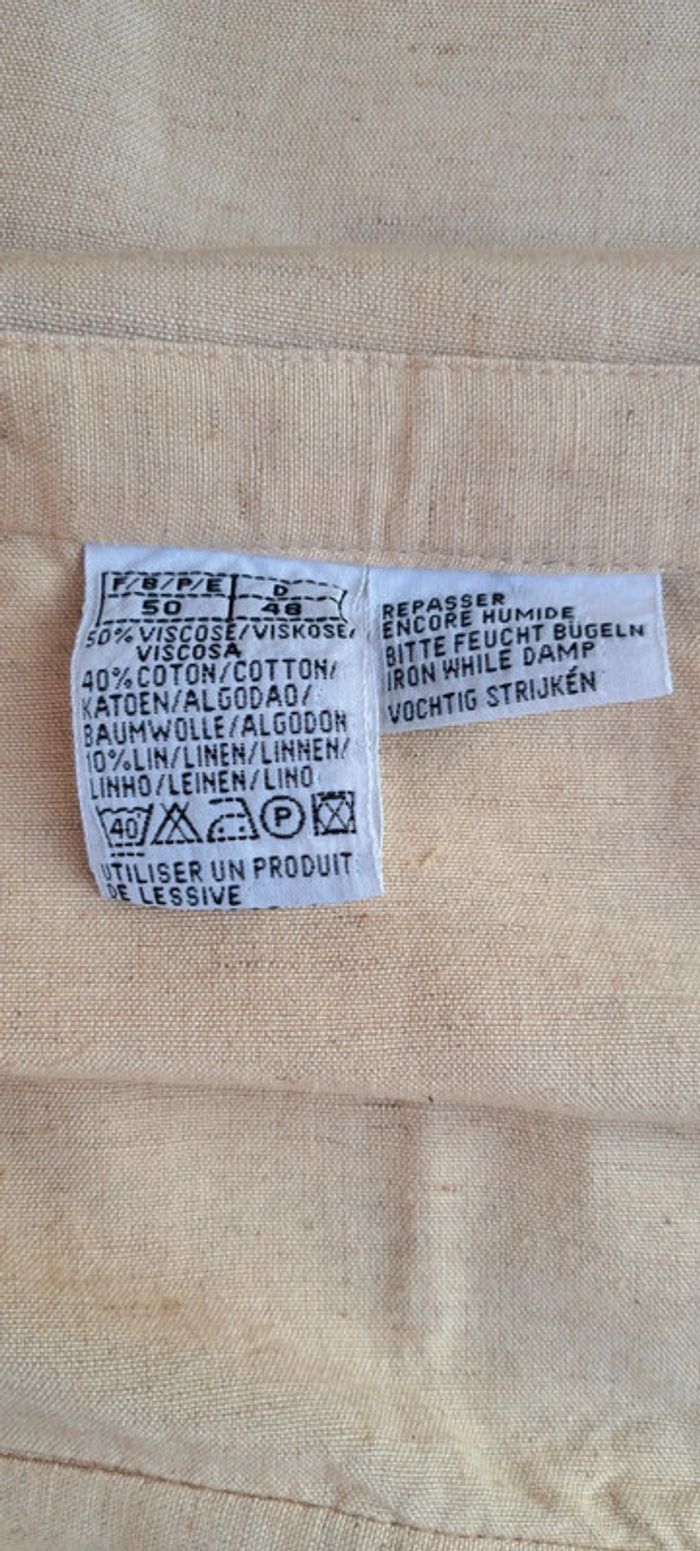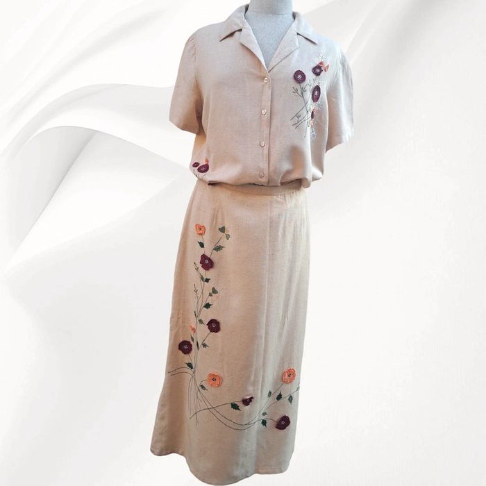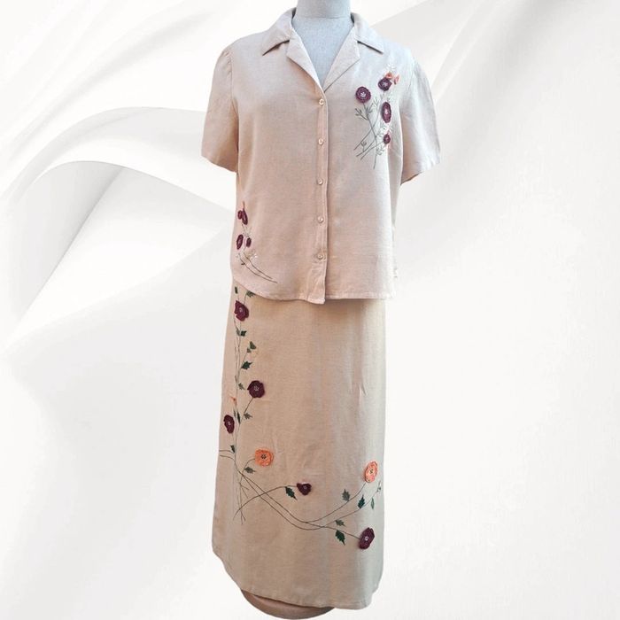 Ensemble d'été en lin : jupe + haut. Taille 46/48. Coloris : beige. Manches courtes. Jupe longue coupe droite. Fleurs brodées. Très bonne qualité. Largeur taille : +-45 cm. Longueur jupe : +-91 cm. Largeur sous aisselles : +-58 cm. 50% viscose 40% coton 10% lin. #grandetaille #grandetaillefemme #ete2023 #lin #fleurs #broderies #broderiefleurs