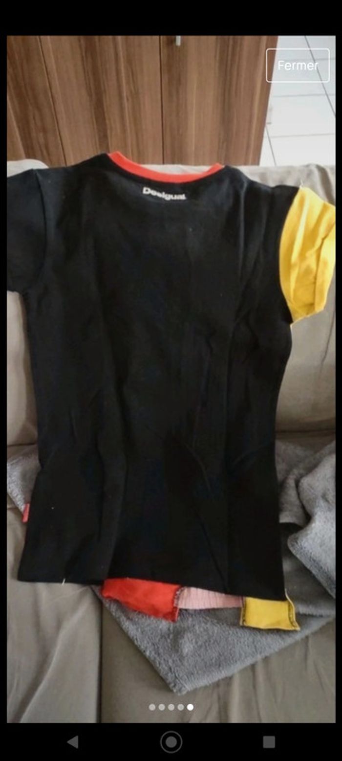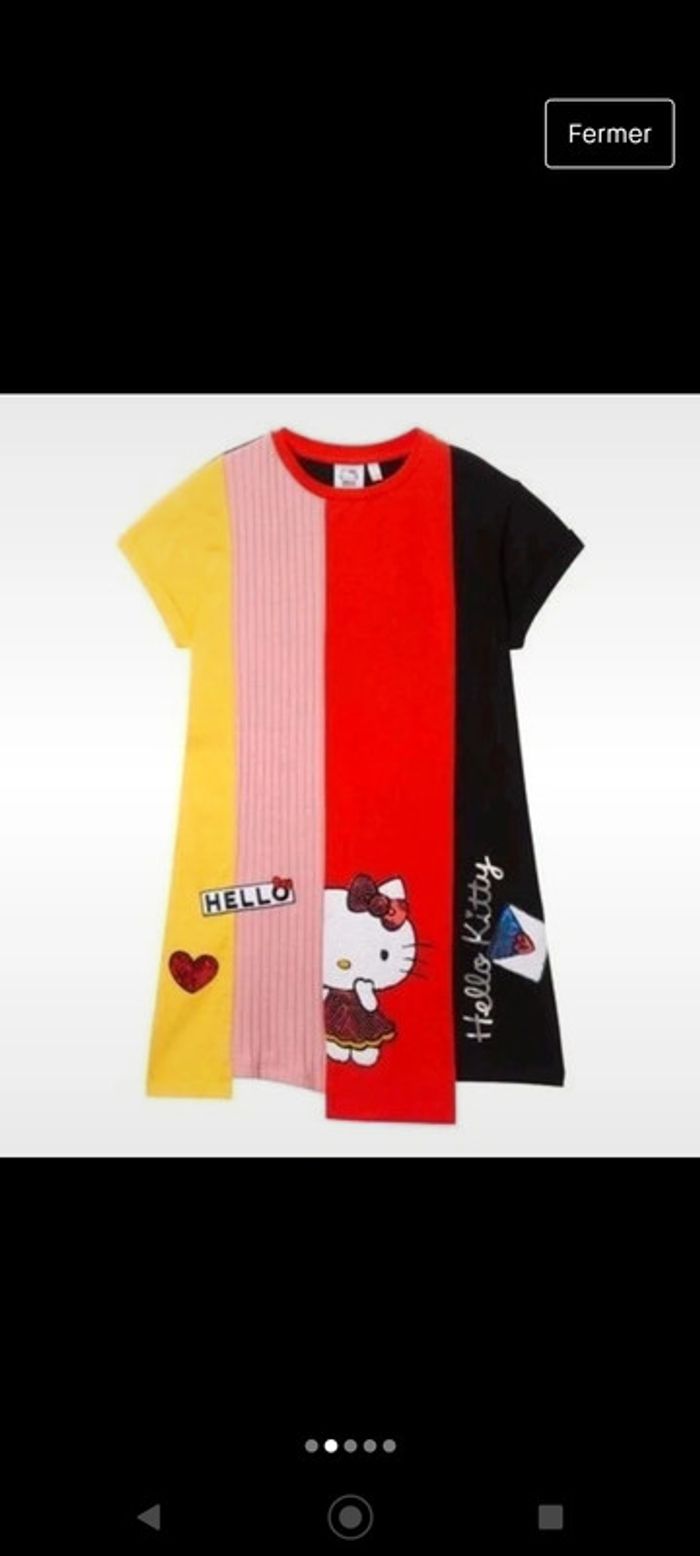 Taille 7/8ans. Il n'y a plus l'étiquette, elle a été portée 2-3 fois depuis les photos Cette robe évasée et courte Desigual composée de coton multicolore présente un col rond, une coupe trompe-l'oeil sur le devant, des manches courtes et des bandes côtelées. Elle se distingue par ses motifs Hello Kitty et par ses empiècements sequins.  Valeur neuve 59€