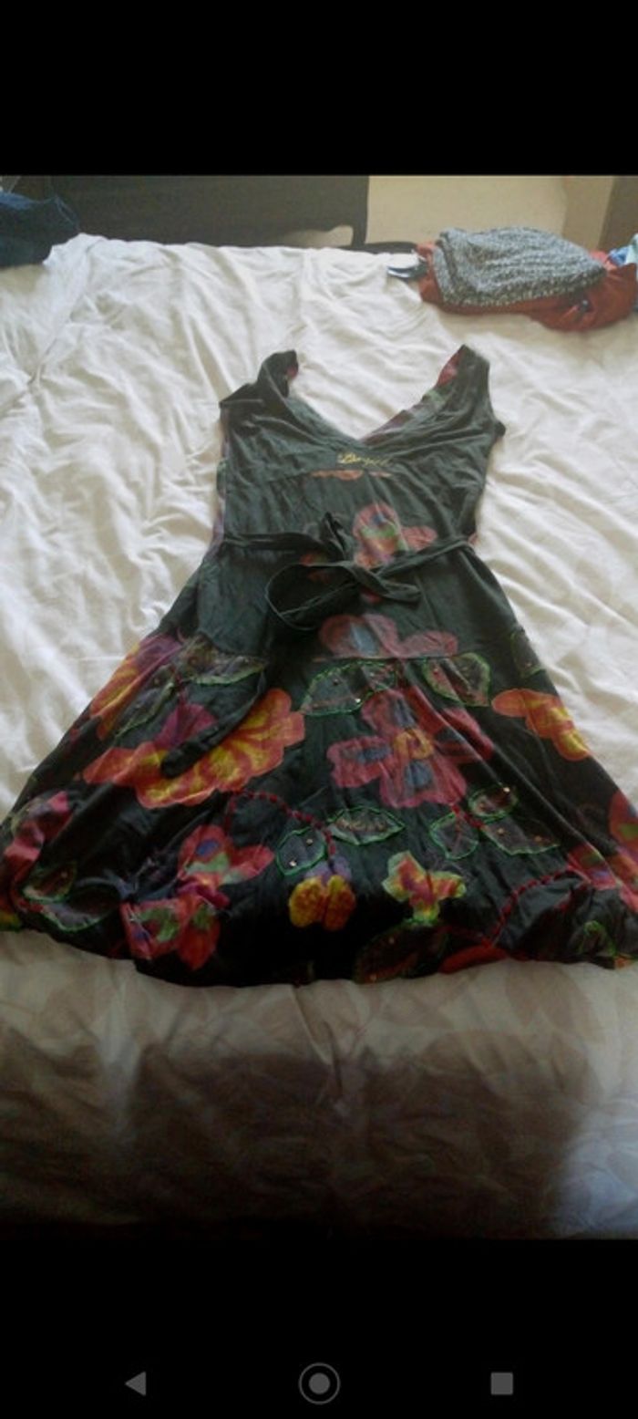Taille XS, décolleté V devant et derrière, bien porté mais en bon état. robes jusqu'au genoux environ. Désolé pour les photos, robe non repassé 🤗