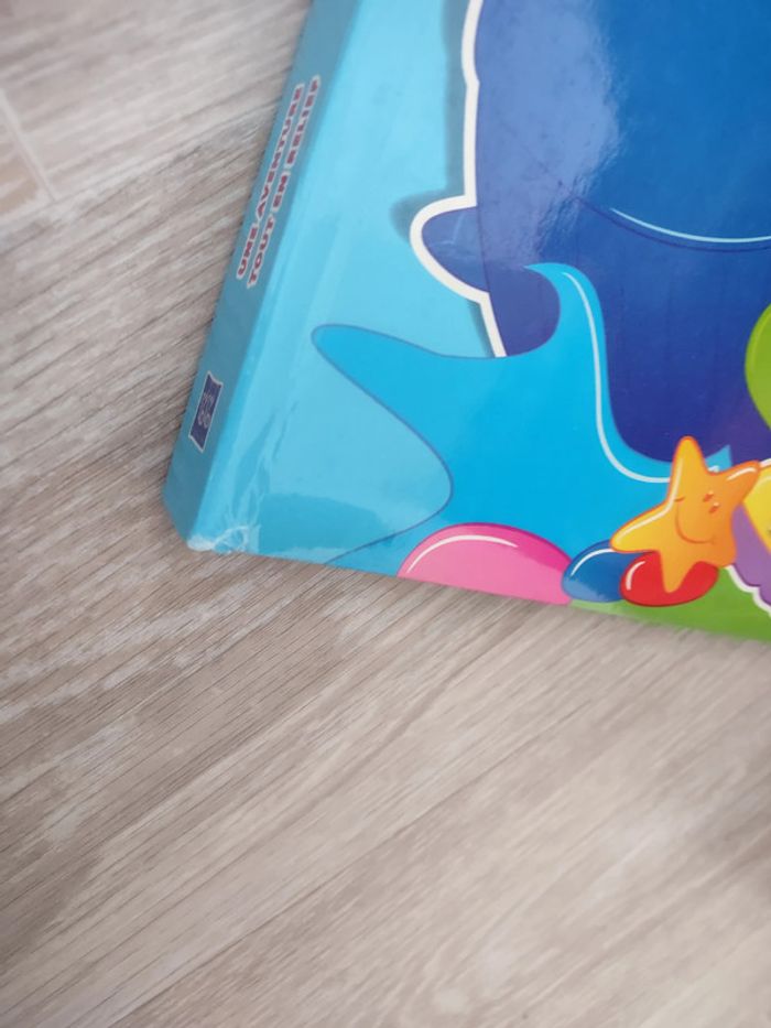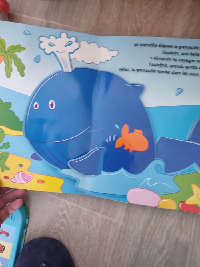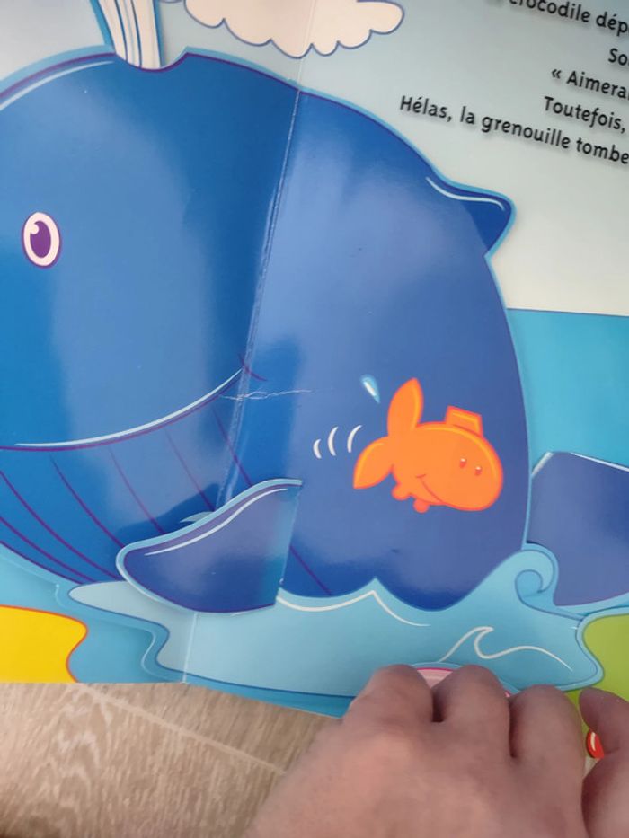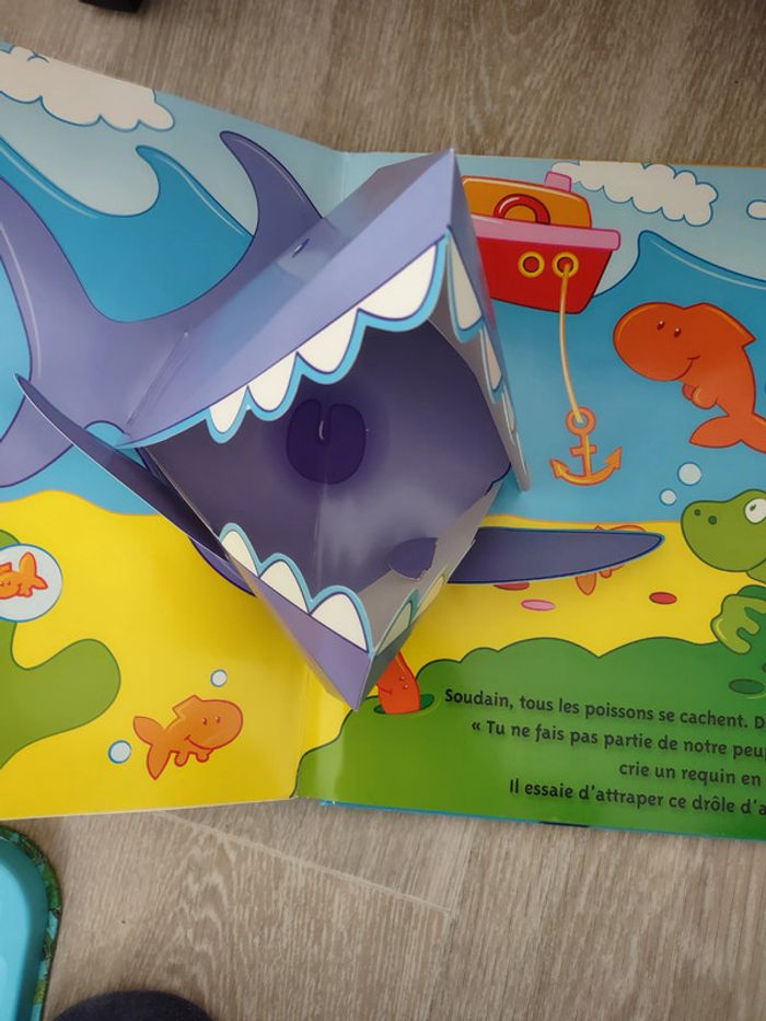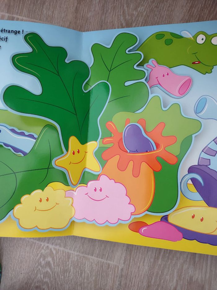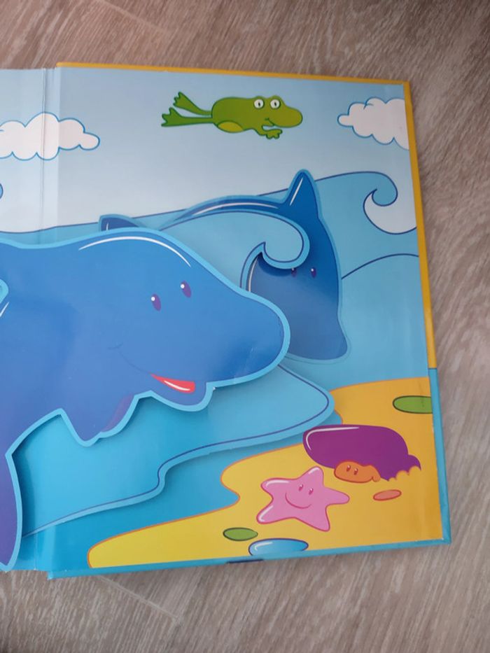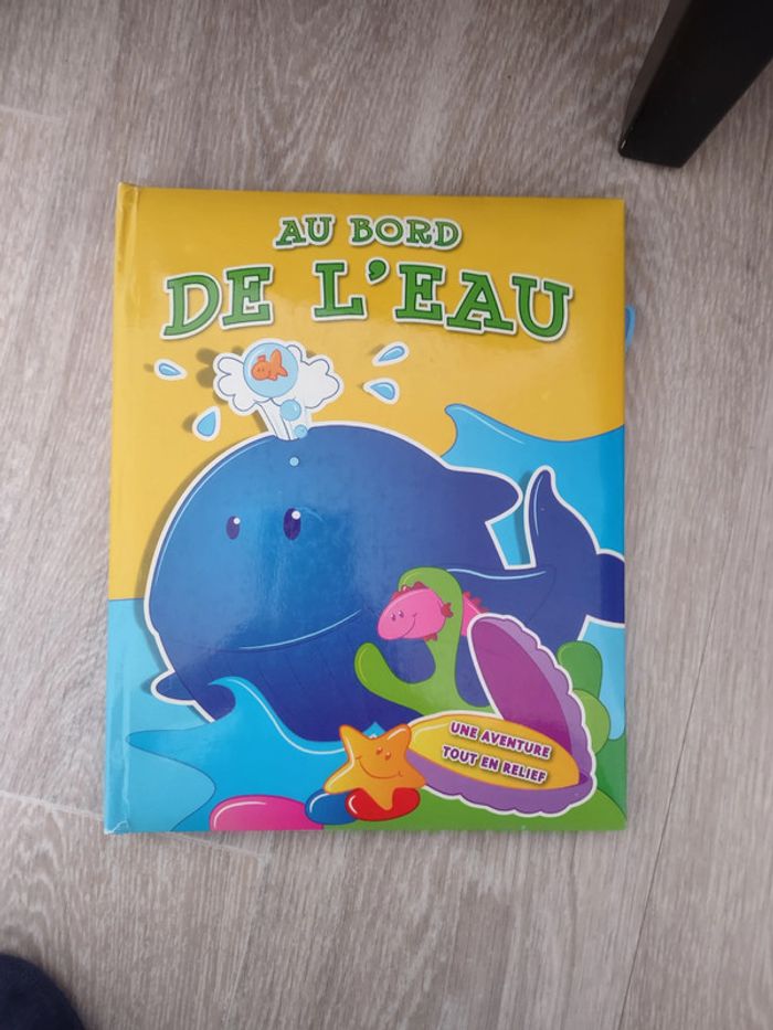 Grand livre très jolie relief. Légèrement usé sur les coins et pliure légère au niveau de la baleine 🐋 Un dauphin est décroché mais possible de le scotché