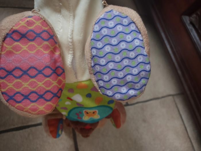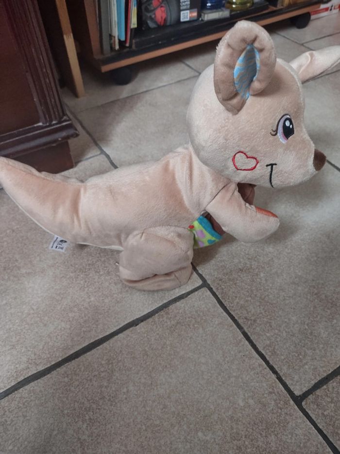 Comme neuf car bébé en a peur Version française La peluche interactive Maman Kangourou avec son petit bébé dans sa poche convient aux enfants de 1 à 4 ans. Ensemble ils se déplacent, sautillent et chantent de belles chansons et mélodies. La peluche interactive Maman Kangou-Love a une poche magique qui reconnait lorsque son bébé y est à l’intérieure ou lorsqu’il est retiré. Si le bébé kangourou n’est pas dans la poche de sa Maman, le petit se met à pleurer. Maman Kangourou et son bébé ont des boutons interactifs qui permettent d’animer les deux peluches animaux, et ainsi faire découvrir à l’enfant les formes et les couleurs. Les boutons interactifs permettent d’activer un des modes de jeu : Bouton « Musique » pour entendre Maman Kangou-Love et son bébé chanter, Bouton « Kangourou » pour découvrir les chiffres, des anecdotes et entendre des sons amusants, Bouton « Cœur » pour entendre les peluches se dire de douces phrases et introduire les émotions. Les peluches interactives Maman Kangou-Love et son bébé savent faire plus de 50 sons, 3 chansons et 10 mélodies, ainsi que des vraies phrases. Ils fonctionnent avec 4 piles LR6 AA incluses.