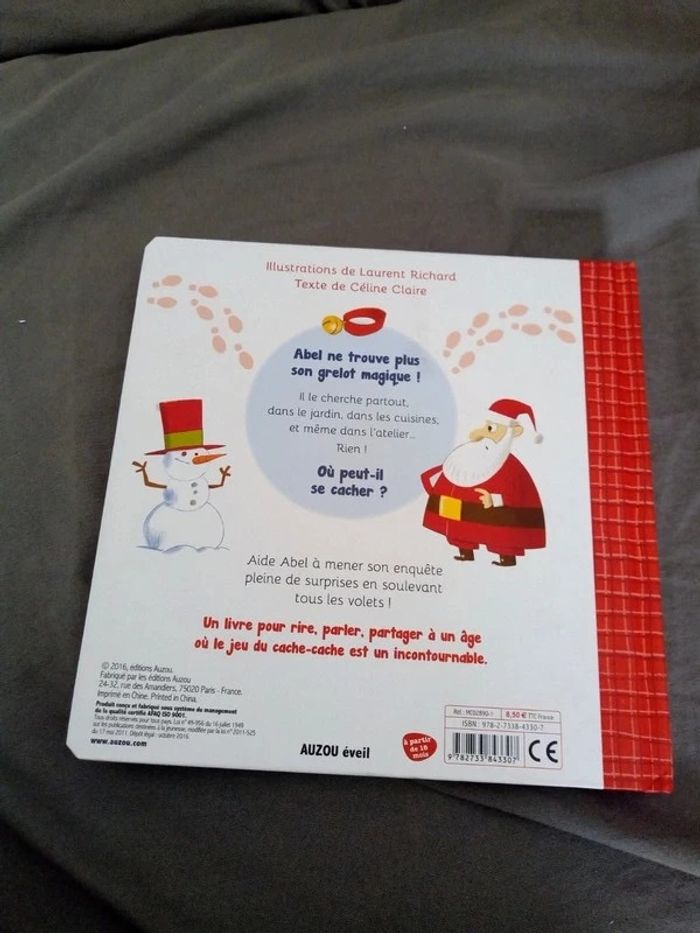 Avec des volets à soulever pour retrouver le grelot, taille moyenne, livre cartonné Le grelot d'Abel lui permet de voler. C'est grâce à lui qu'il peut aider le père Noël dans sa tournée. Mais malheur ! Il l'a égaré... Comment le retrouver ?