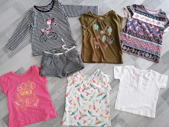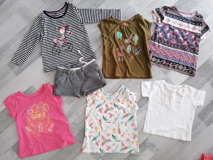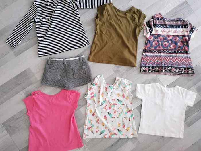 Lot de 7 articles fille Taille 12 - 24 Comprenant : - 4 thee shirts, Lupilu 12-24 mois - Un thee shirt manches longues rayures motif, Lupilu - Un thee shirt blanc brodé, 12 mois, Super U - Un short épais gris, Kiabi, 24 mois