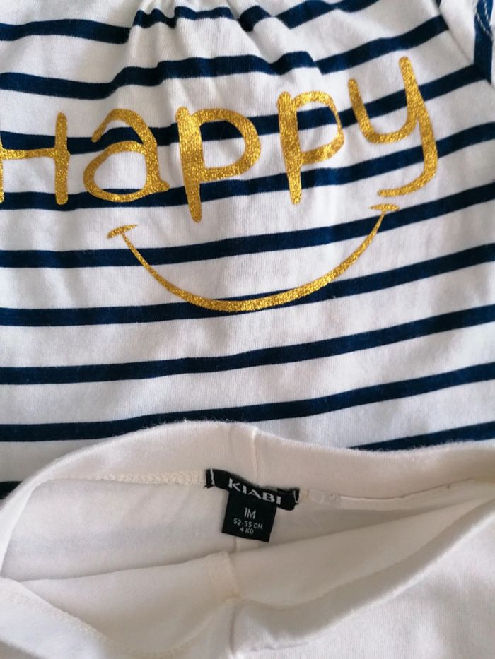 Lot de 3 articles bébé fille Taille 1 mois Comprenant : - Un ensemble marinière bleu blanc happy en doré, Kiabi - Un ensemble rose, Absorba, tâche par endroit - Une robe été rose délavé par endroit suite au stockage dans une box, mais reste correct, Kiabi plus d étiquette