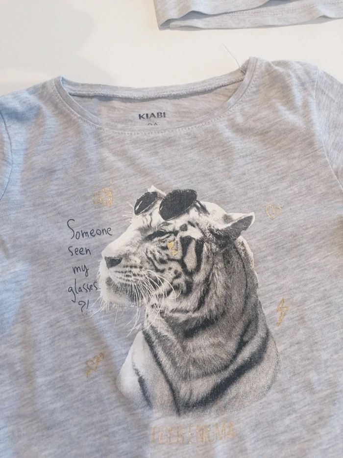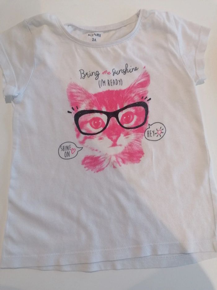Lot de 5 articles fille Taille 2 ans Comprenant : - Un thee shirt vert menthe motif pastèque, Kiabi - Un thee shirt blanc à motif chat orange, Kiabi - Une chemise manches longues * tâche fluo légère en bas *, Esprit -Un manches longues gris à motif tigre, Kiabi -Un manches longues gris à motif pinceaux