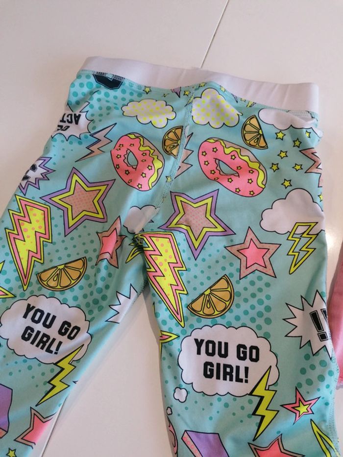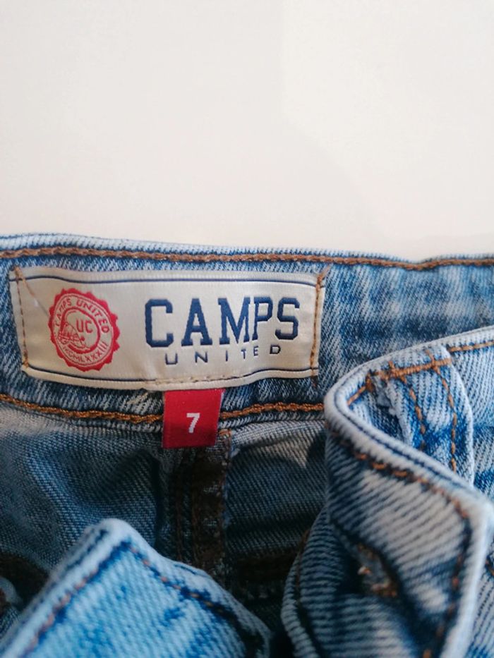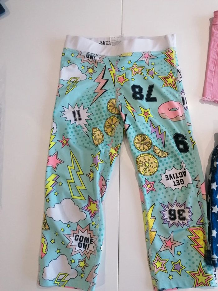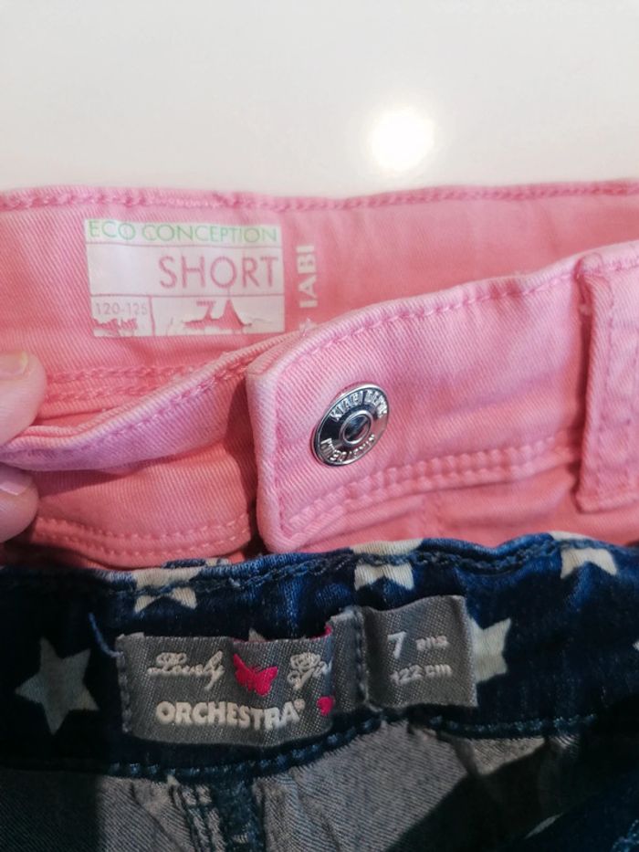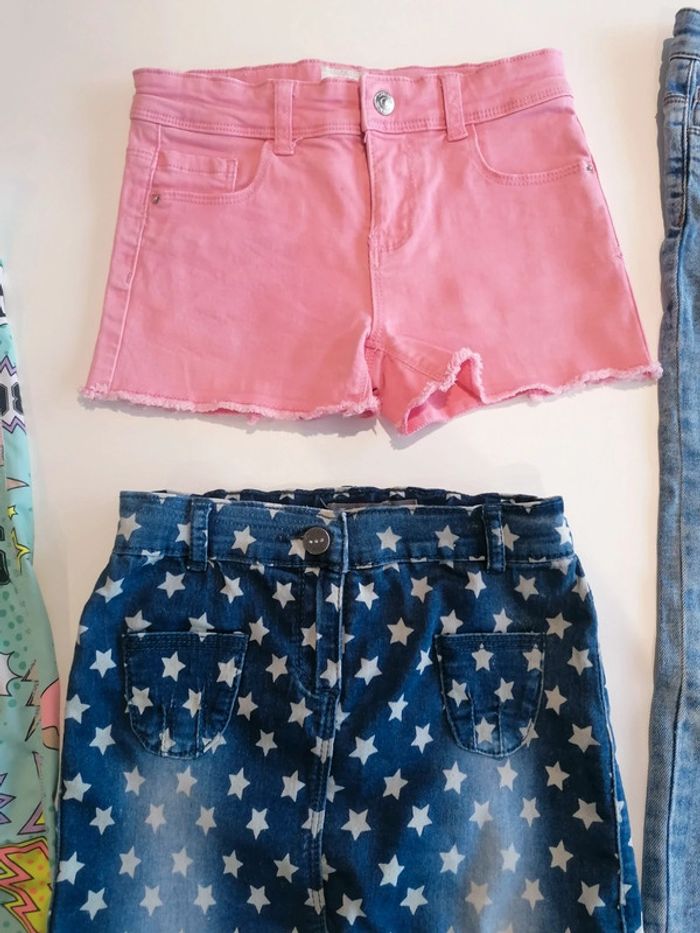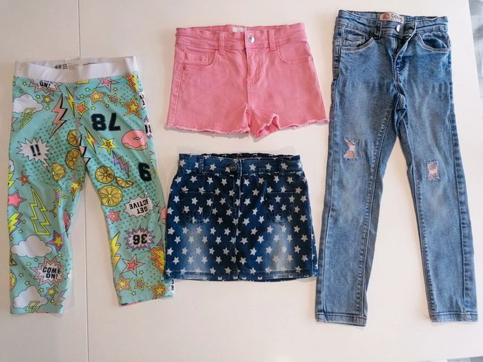 Lot de 4 articles fille Taille 7-8 ans Comprenant : - Un legging multicolore 6-8 ans, H&M - Un short rose fluo effilé, Kiabi - Une mini jupe en jeans, Orchestra -Un jeans, Camps