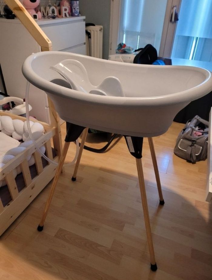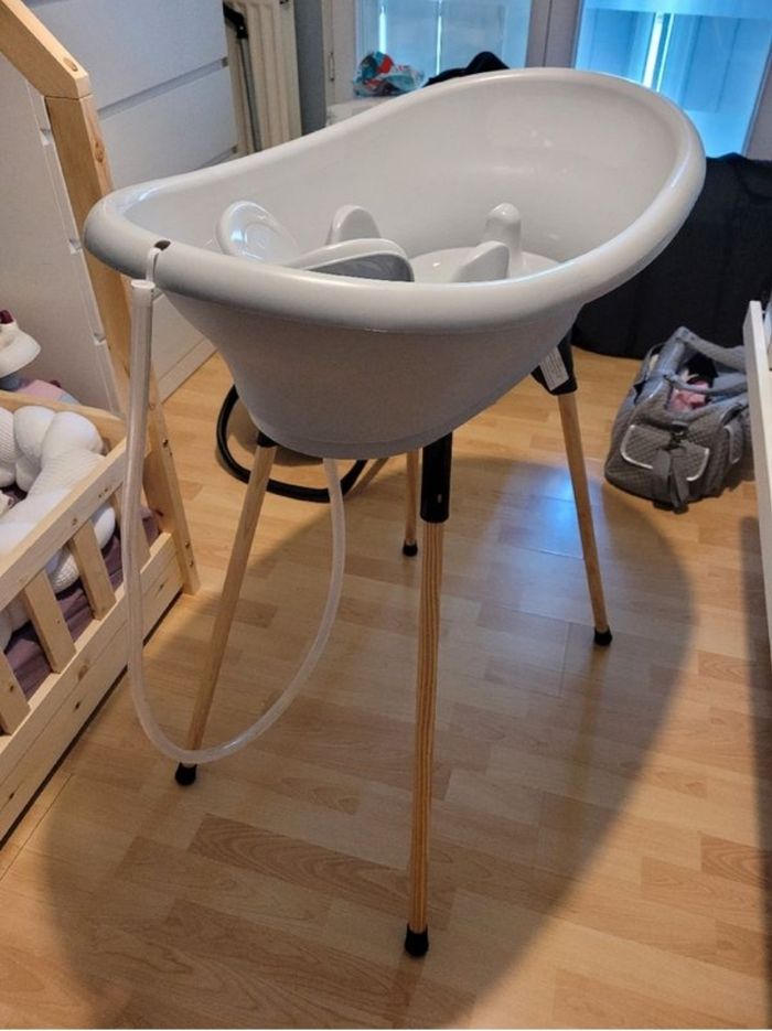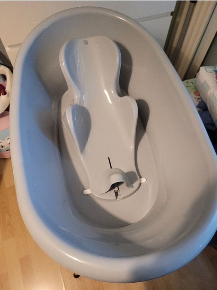 Baignoire pour bébé Thermobaby Vasco grise. Sur pieds, permet de laver bébé sans se faire mal au dos. Le transat de bain peut encore servir mais la tirette qui bloque l'assise est cassée (voir les 2 dernières photos) Éponge, brosse et thermomètre inclus. Tuyau d'évacuation d'eau inclus également Bon état général A venir chercher sur place. Pas d'envoi. -30% avec le code BONUS30 jusqu'au 28 Août