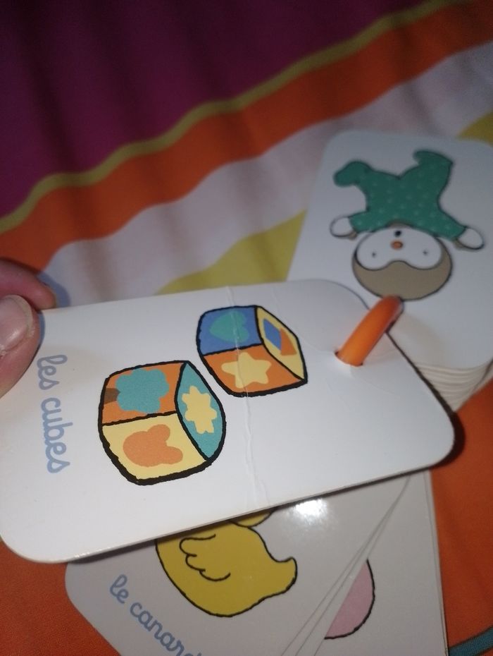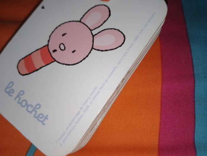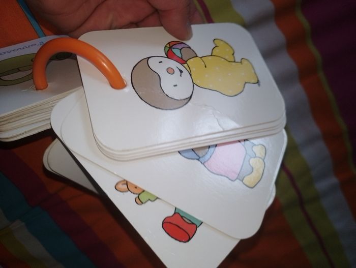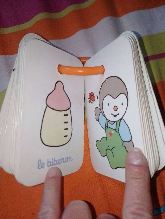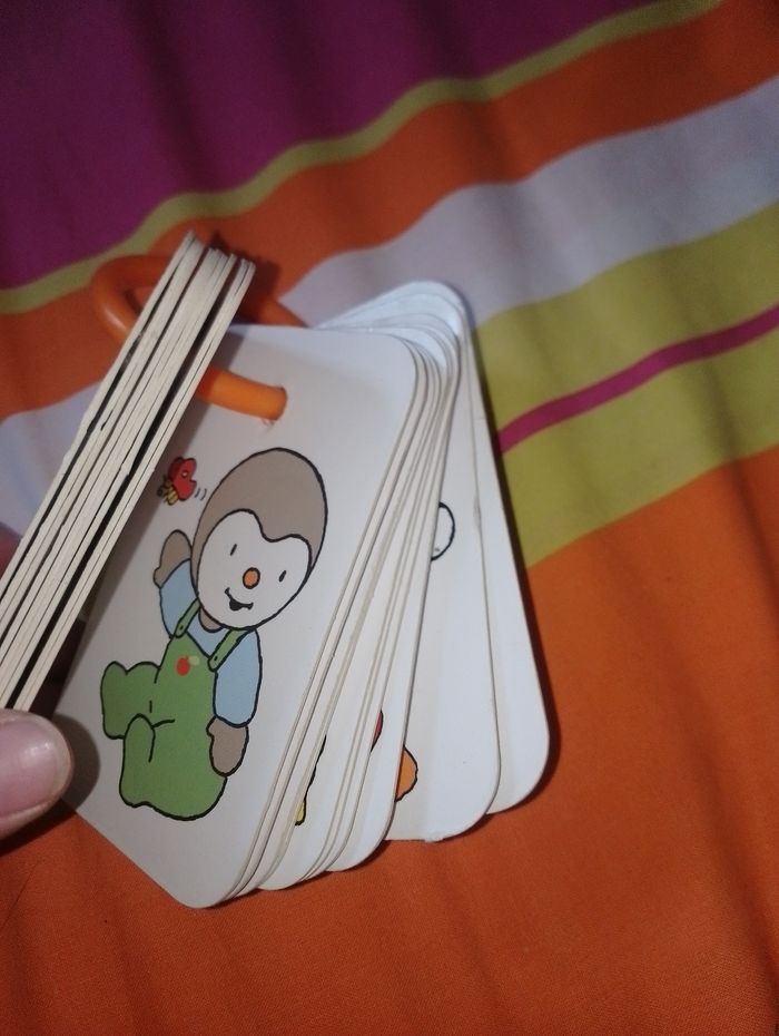 Carte d'apprentissage sur anneau T'choupi Nathan 19 cartes Exemple : Recto 1 image de cuillère et le mot cuillère Verso T'choupi a tablée avec 1 cuillère a la main en train de manger En bon état Certaine cartes sont un peu abîmé