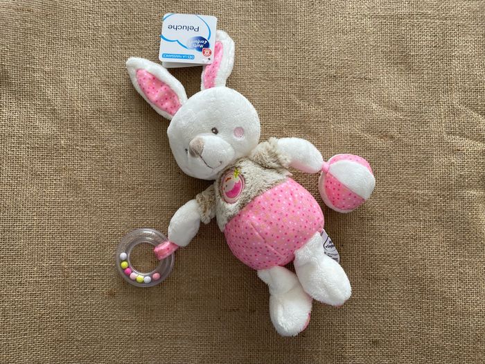 Doudou lapin d’activité rose et blanc Mots d’enfants