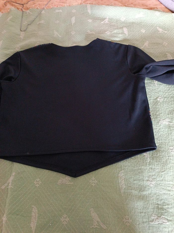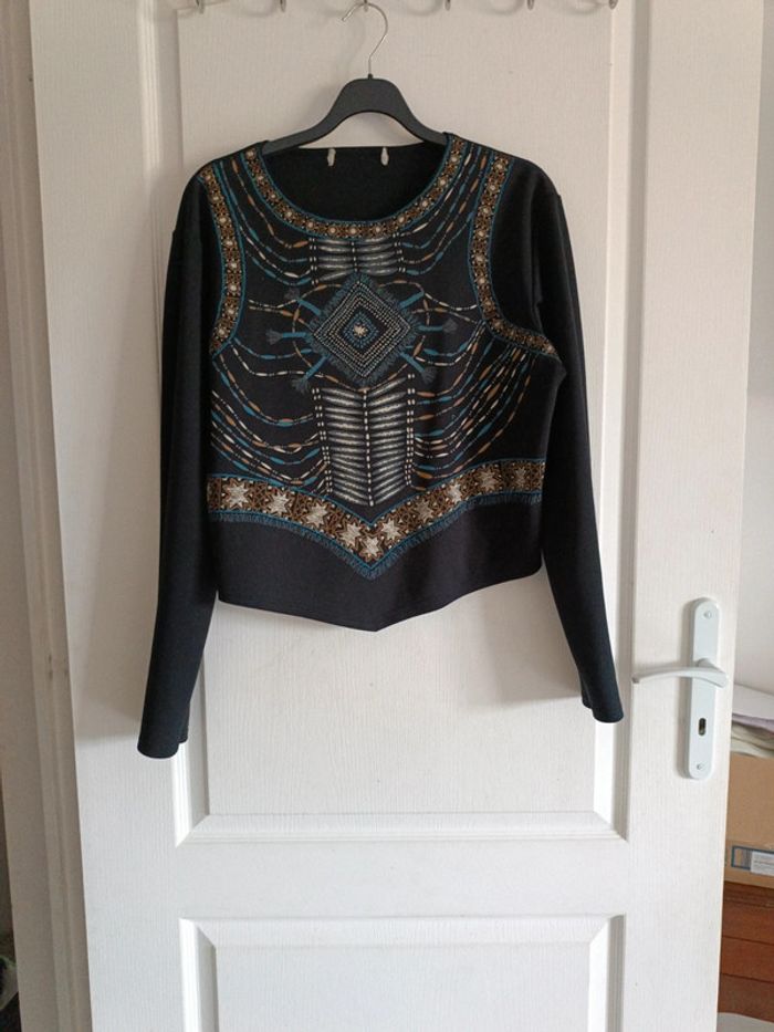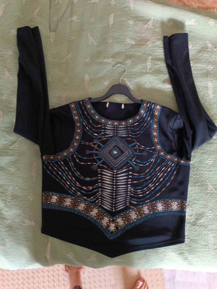 Crop Top noir, décor indien, T46, épaules 46 cm, aisselles 53 cm, longueur devant en pointe 53 cm, longueur dos plus court 47 cm. Manches 60 cm. Polyester, élasthanne. Comme neuf. TBE