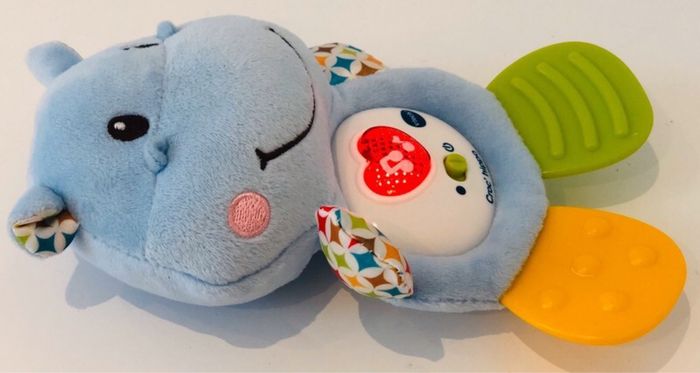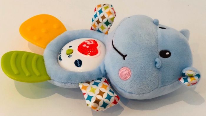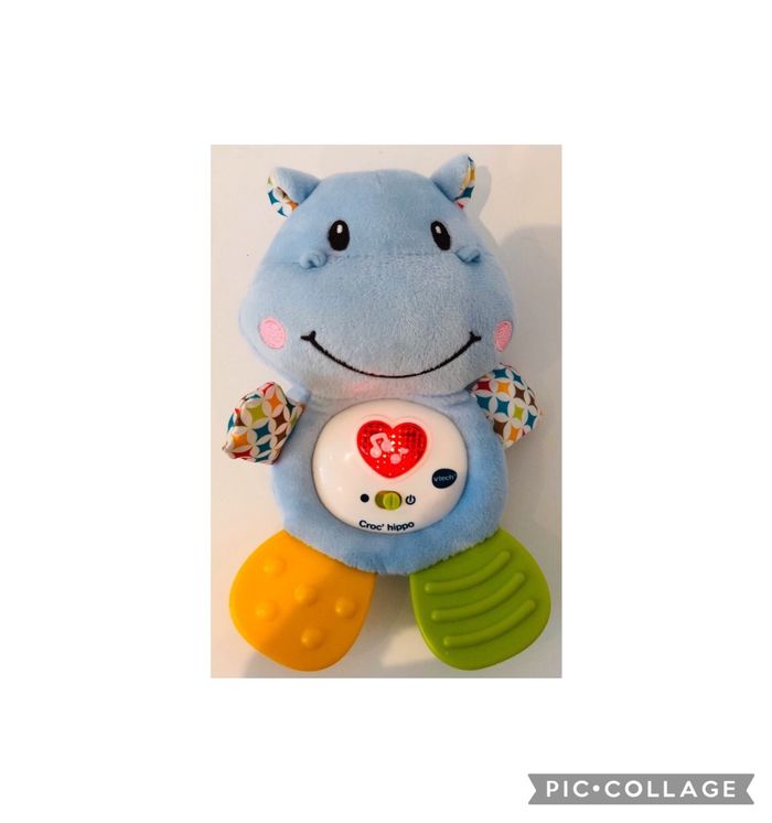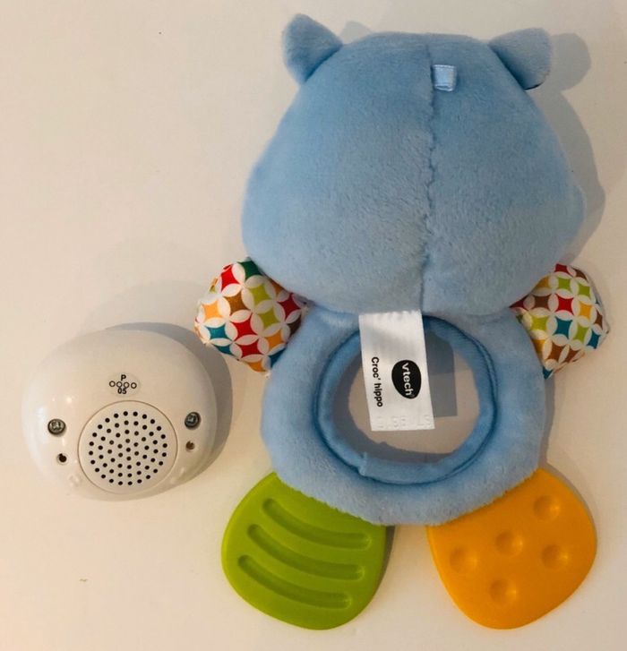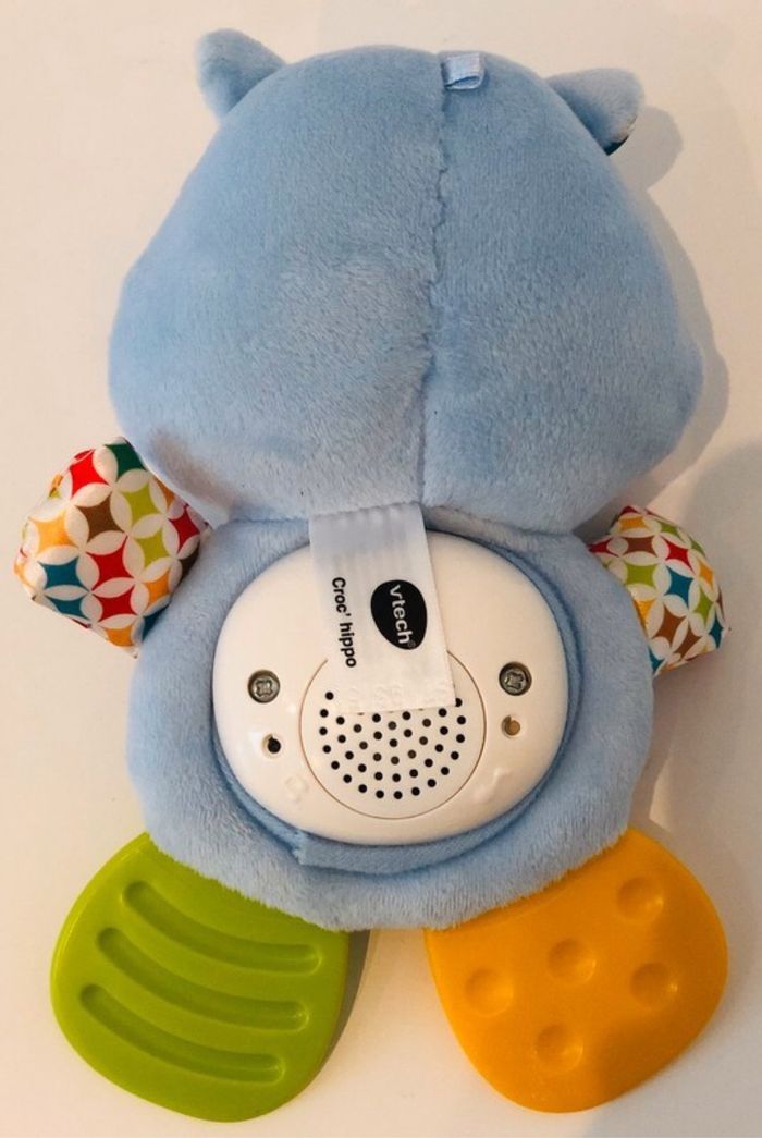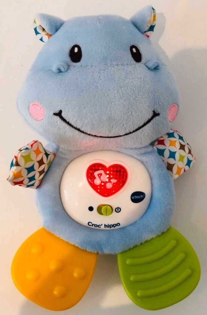 Vtech 80-502555 croc hippo bleu 0-24 mois peluche hippopotame hochet musical jouet d’éveil sensoriel textures anneaux de dentition +30 phrases chansons mélodies et sons amusants rose lot SOP77 A saisir : 7€ DESCRIPTION :  Bébé découvre un copain tout doux à câliner en musique, un hochet musical qui soulage les poussées dentaires de Bébé. Avec différentes textures pour stimuler ses sens : corps en peluche et pattes arrière en plastique souple.  Un bouton coeur lumineux pour déclencher de douces phrases, chansons et des mélodies. Le coeur clignote au rythme de la musique.  Deux pattes souples à mordiller pour soulager les gencives et apaiser les poussées dentaires de Bébé.  Plus de 30 phrases, chansons, mélodies et sons amusants.  3 chansons et 10 mélodies.  Arrêt automatique.  Module électronique détachable pour un lavage facile de la partie en textile (lavage en surface uniquement).  Fonctionne avec 3 piles bouton LR44 non fournies. Age : 0-24 mois Réf : croc hippo Vtech  - 80-502555 - B07MF9N6CQ Expédition sous 24-48h Remise en mains propres possible à MEAUX (77100) quartier de la gare ou à :  . Trilport, Varreddes, Germigny-l’Evêque, Lizy sur Ourcq et May Acy en Multien. . Chauconin, Monthyon et Saint Soupplets . Chessy TGV Serris / Marne-la-Vallée / Val d'Europe / Claye-Souilly et Villeparisis