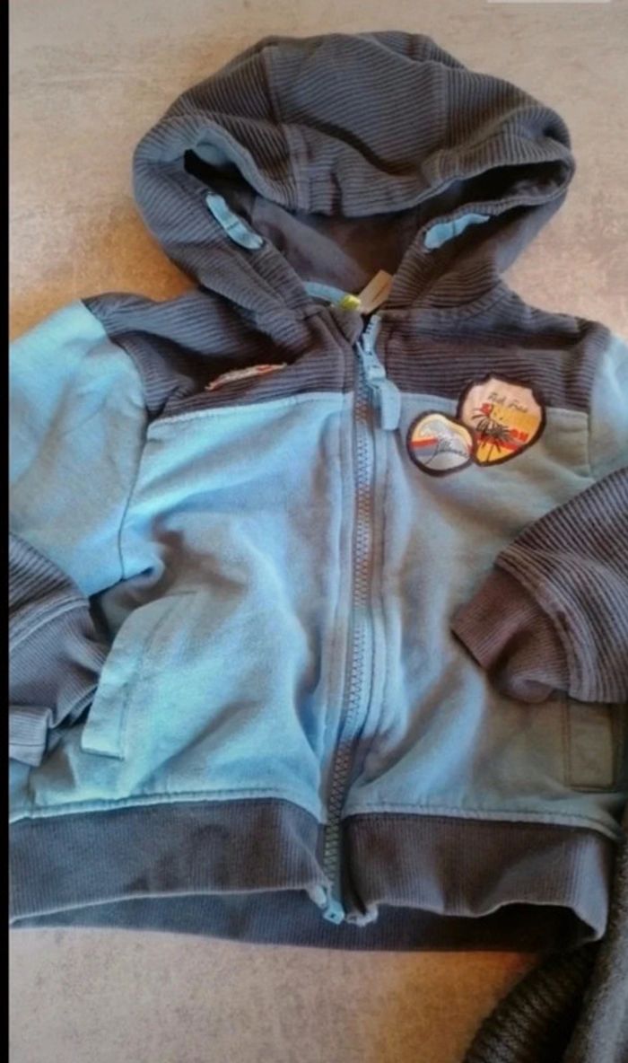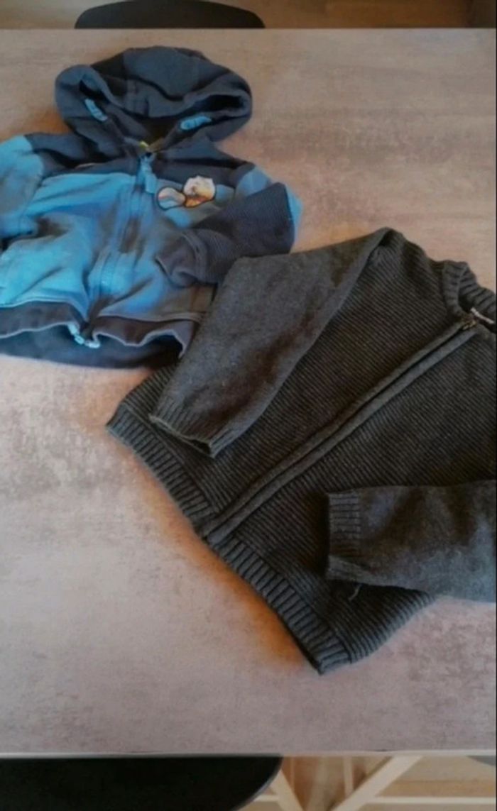 Deux gilets 3 ans 98 cms un orchestra et l'autre auchan le gris tache sur la manche voir photos ce vois a peine et sur le bleu tache sur capuche voir photos #titiethan3ans
