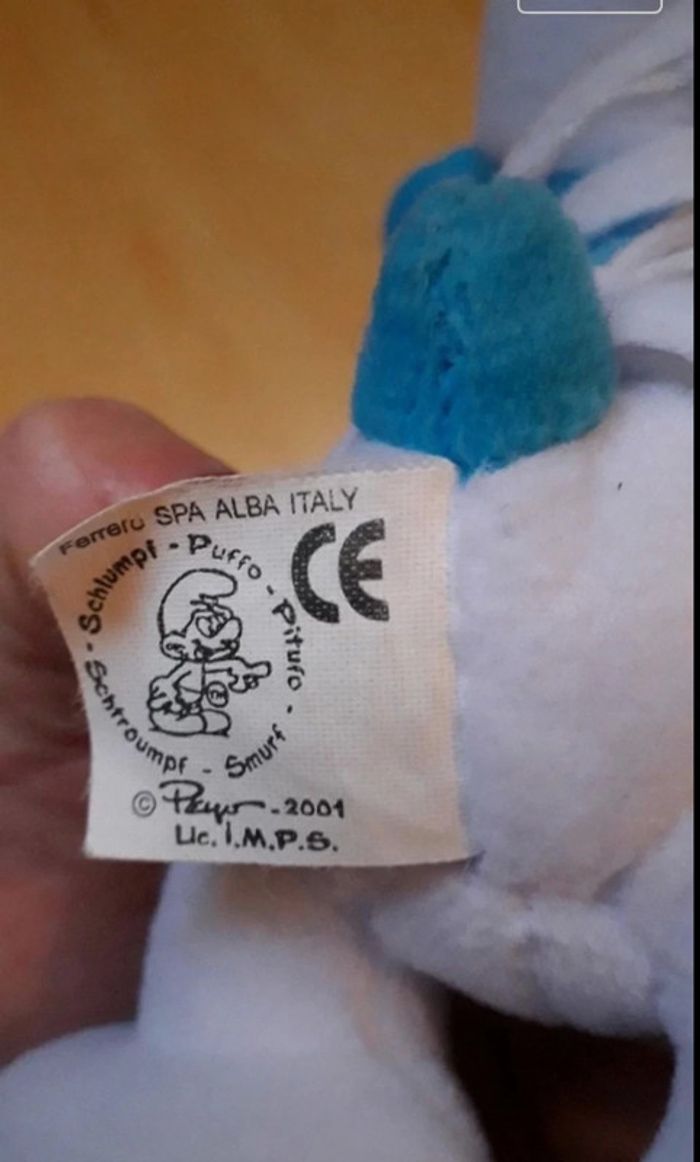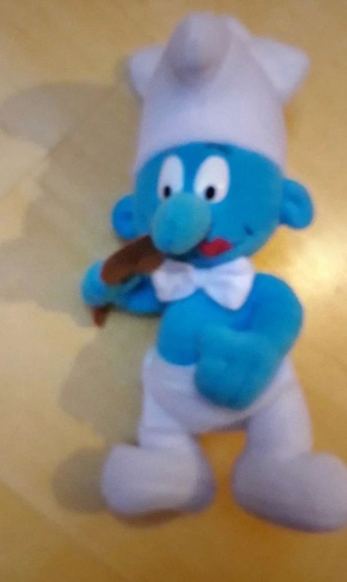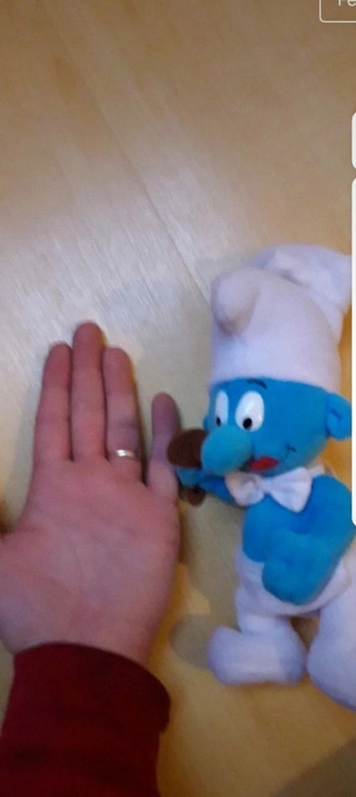 Peluche schtroumpf cuisinier pour la longueur vu que je ne sais pas jai mis ma main à coter de la photo pour que vous voyez a peu près la longueur. #titiethanpeluche