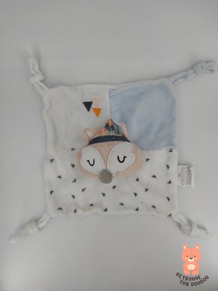 🦊 Doudou Plat renard blanc bleu beige plumes SIPLEC, Leclerc 📏 Dimension : 20 x 20 cm environ ✨ Occasion, bon état, les motifs triangles s'écaillent 🧼 Lavé avec lessive hypoallergénique 👀 Vous achetez le doudou que vous voyez sur les photos.