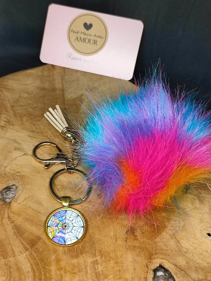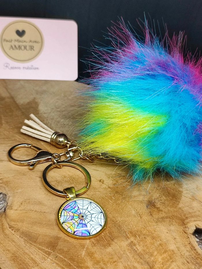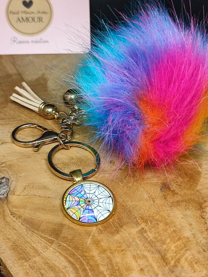 Porte clef avec cabochon en verre de 25 mm fait main Thème Mercredi Addams Pompon multicolore #julierosova_faitmain #julierosova_creation #porteclef