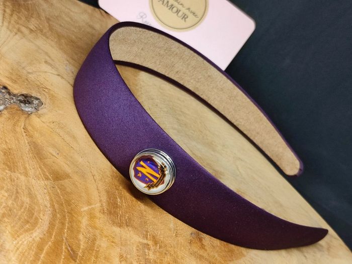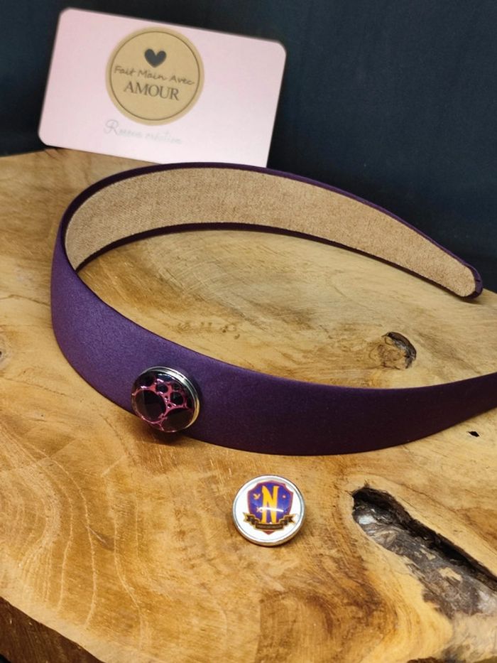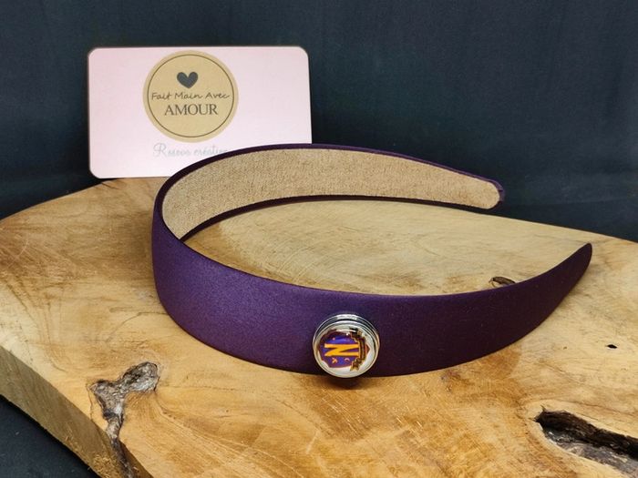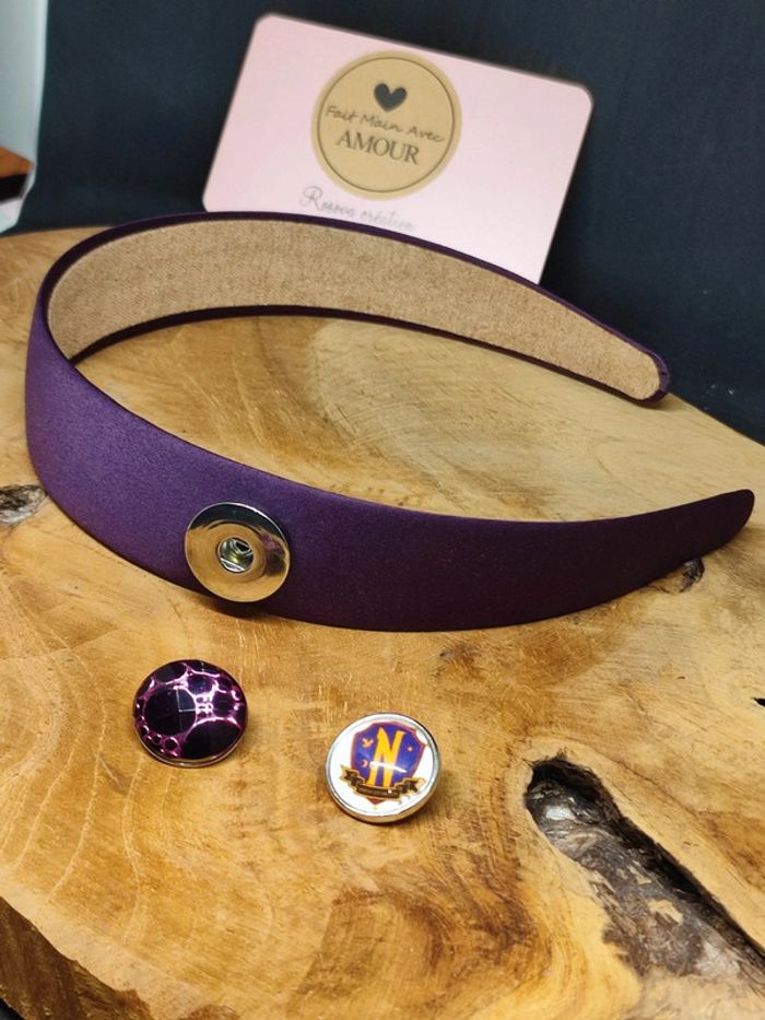 Serre tête satin violet avec 2 pressions interchangeable une pression snap cabochon en verre de 16 mm fait main et une pression avec perle plate Un support mais des milliers de possibilité La pression supplémentaire est au prix de 1€ #julierosova_faitmain #julierosova_creation #faitmain #serretete #pressionsnap