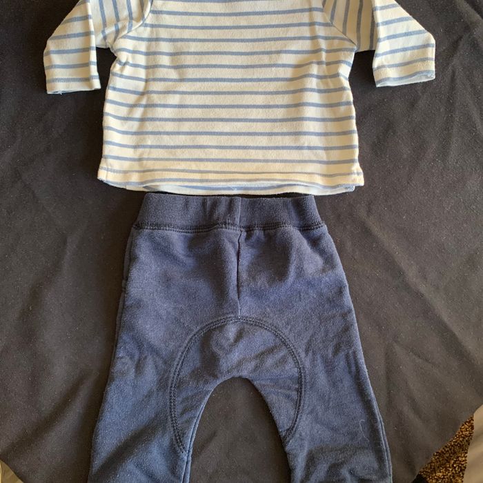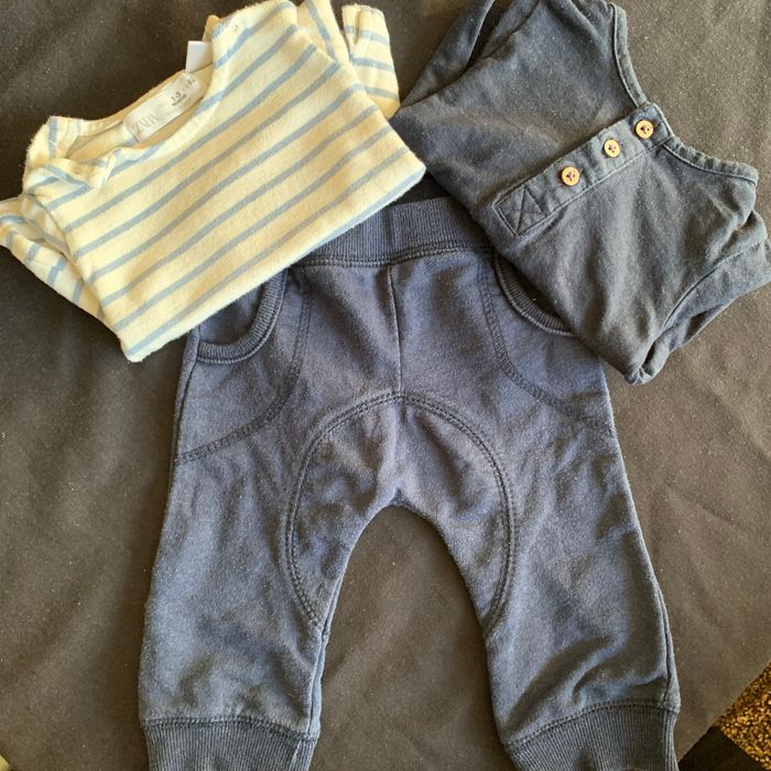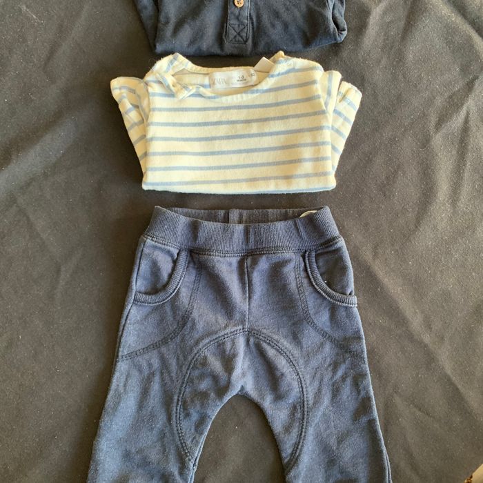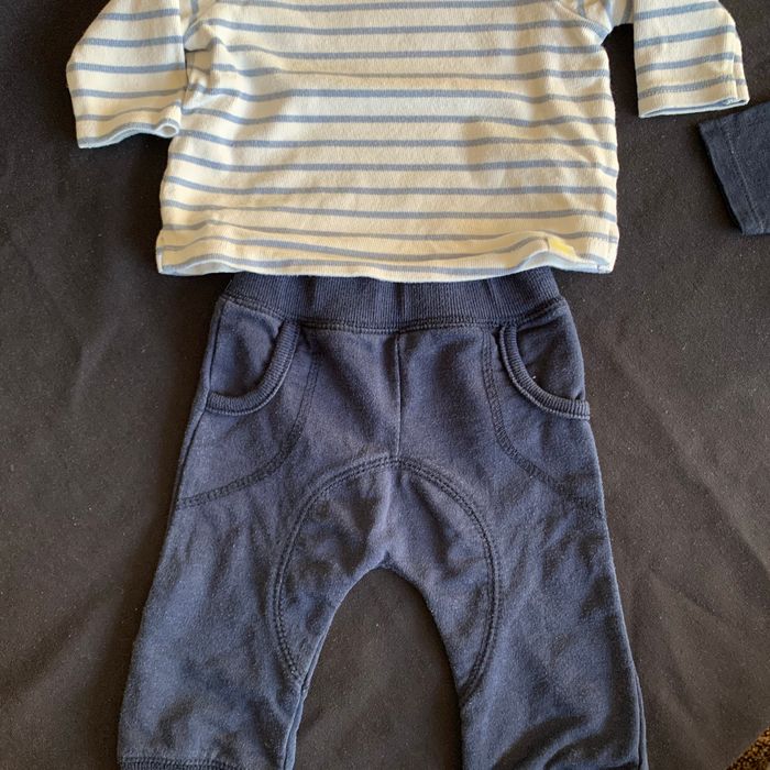 Comprend : * 1 jogging bleu marine 1 mois : légères bouloches * T-shirt manches longues Kiabi Mini chou bleu foncé 1 mois * Pull à rayures Zara 1-3 mois Pas de tâches, ni trous