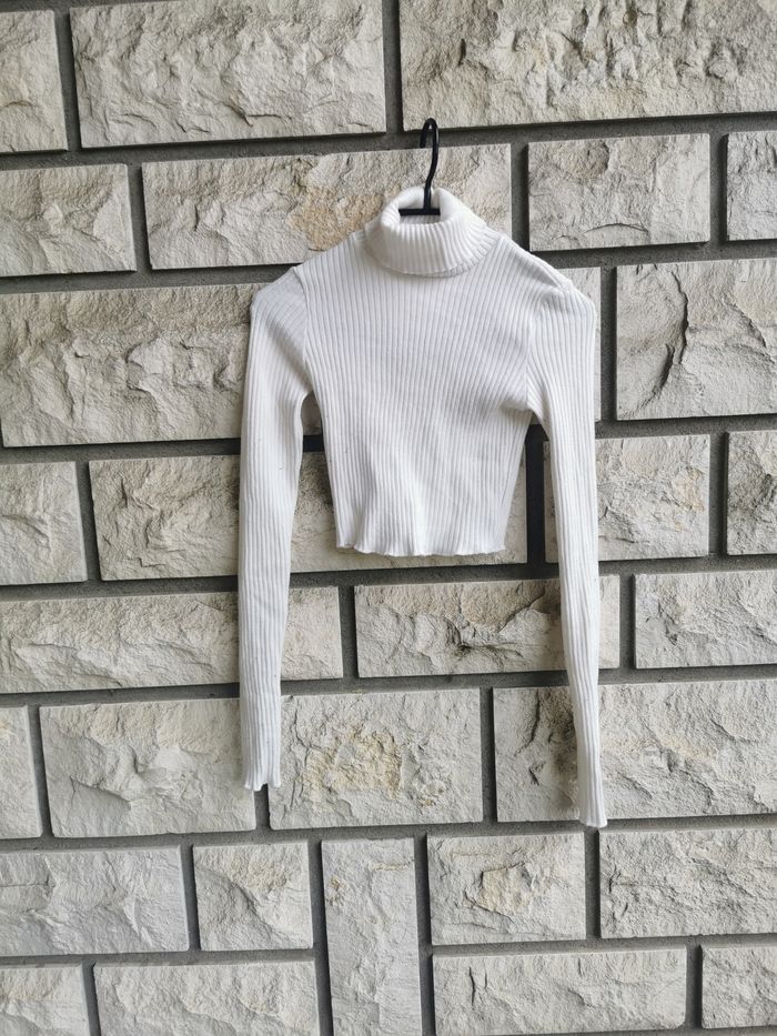 Joli croc top assez chaud à col montant. En très bon état. De la marque BERSHKA. De couleur blanc crème. De taille XS. 50% viscose 28%polyester 22% polyamid