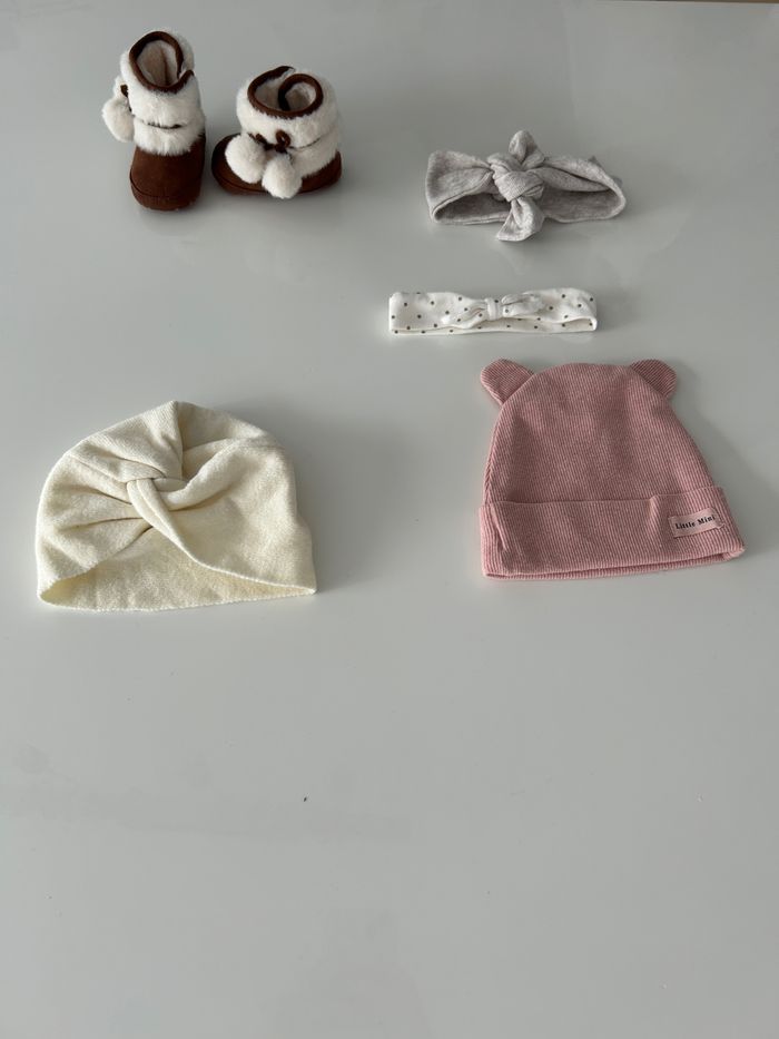 Petite botinne taille 3/6 mois 2 bandeaux 2 bonnet Le tout en parfait état. Voir état neuf.