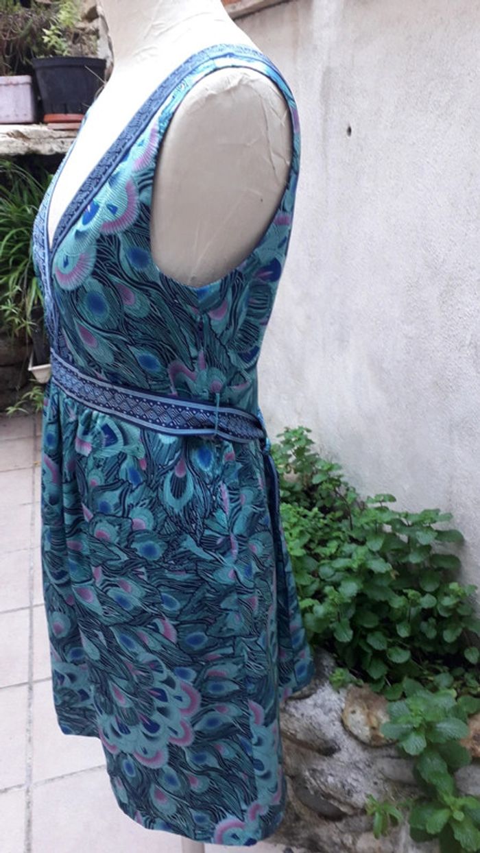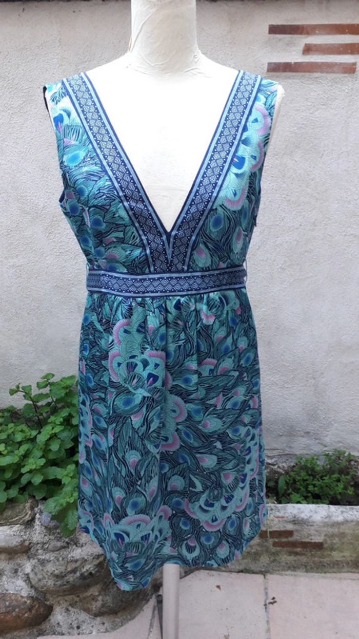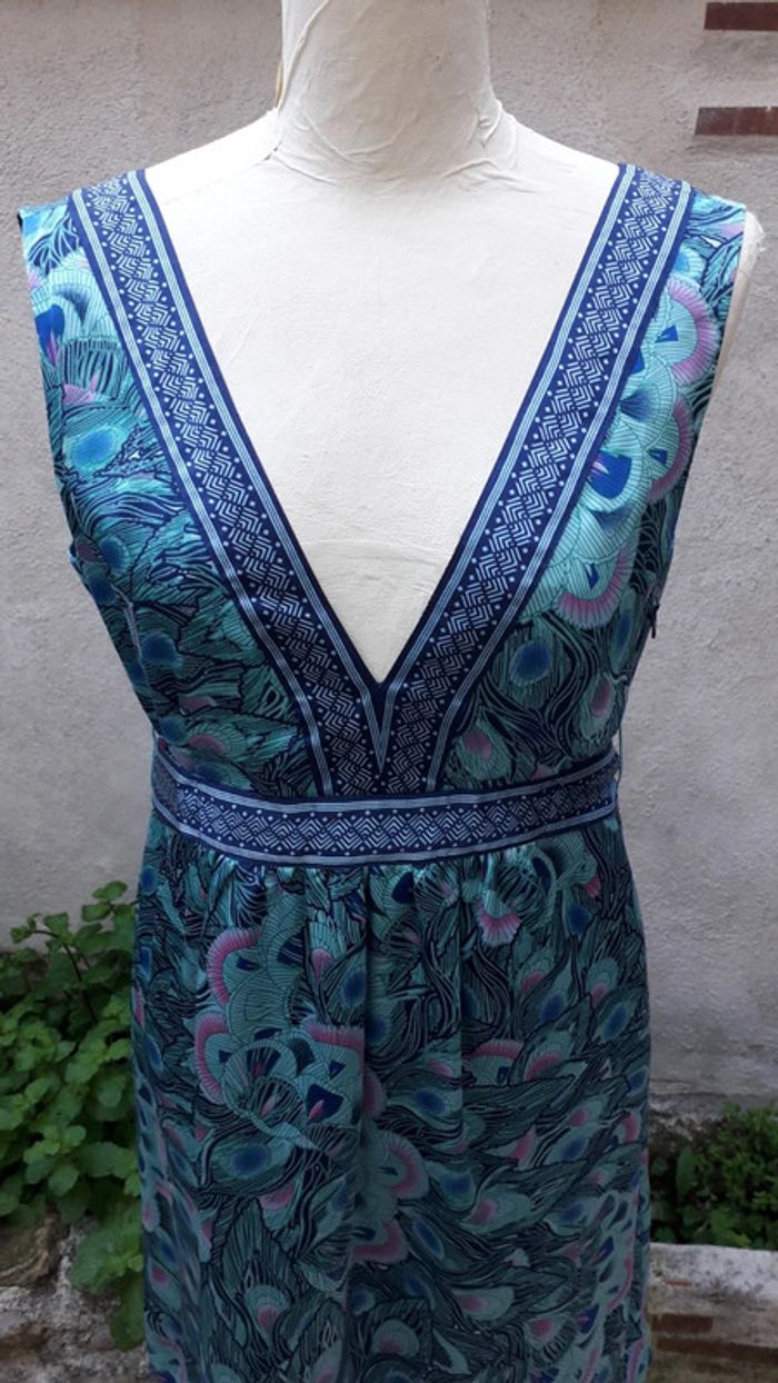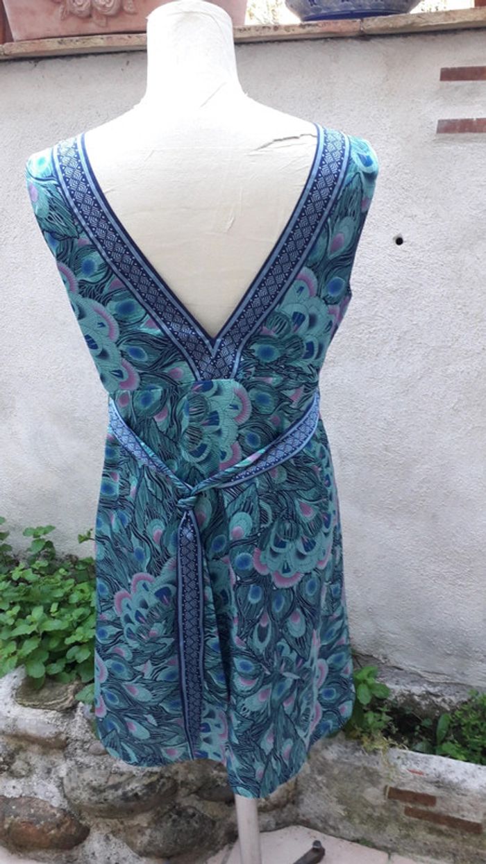 Magnifique robe satinée, décolleté profond devant et dos Portée une fois. Ceinture à la taille. Glissière sur le côté Doublée. 100% polyester Longueur 90 cm Beau panaché de bleus et de verts.