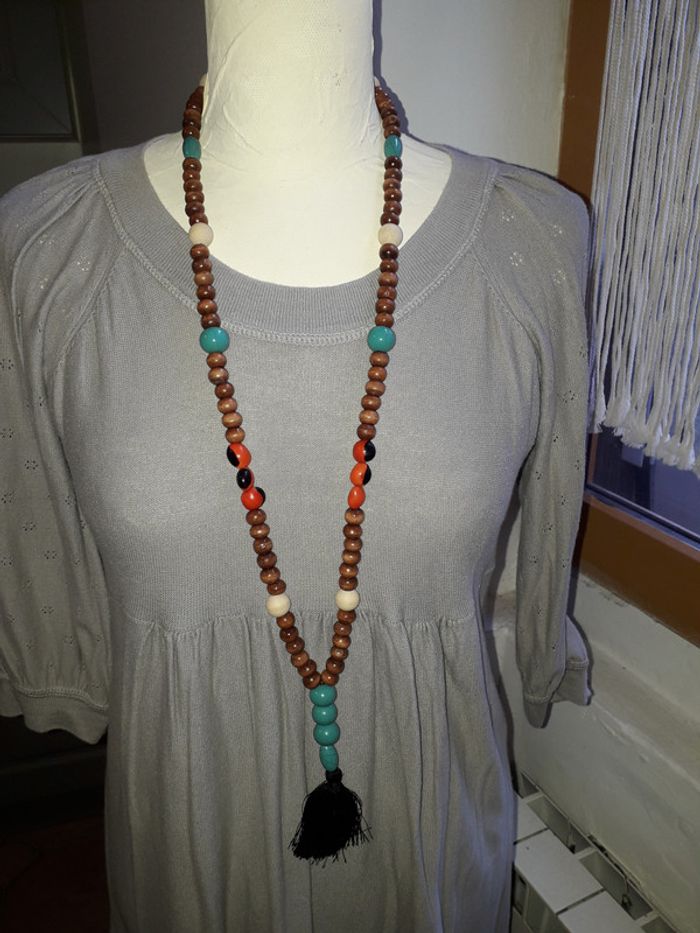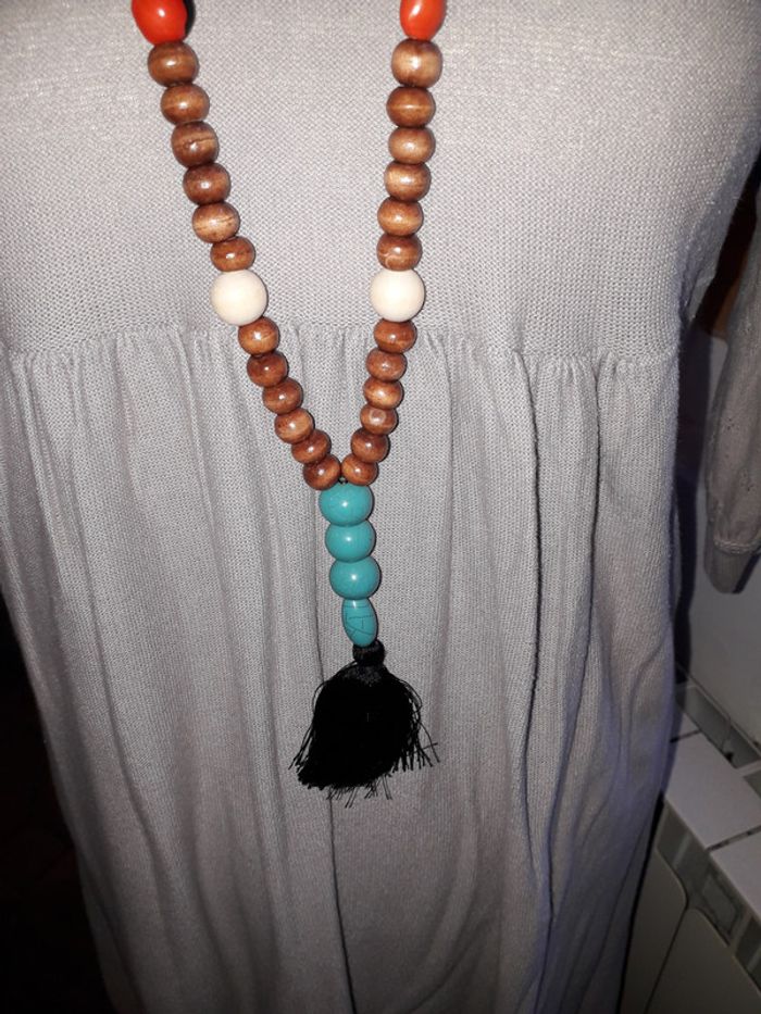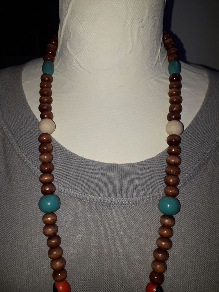 Perles en bois, turquoises, graines du Costa Rica. Style ''bohème / chic'' se porte en toutes occasions 😉 Idée cadeau fêtes de fin d'année 🎄🎄🎄 sera livré dans pochette cadeau en kraft rouge. Longueur 57 cm