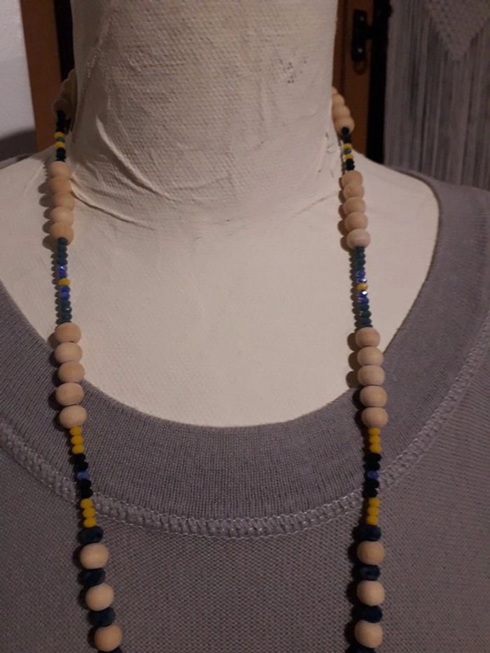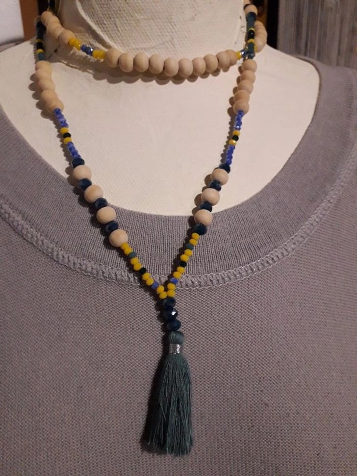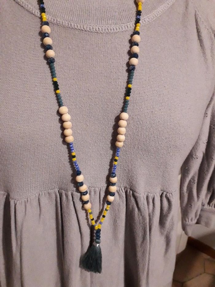 Sautoir en perles de bois et perles de verre, pompon en coton, style ''bohème / chic'' Idée cadeau de fêtes de fin d'année 🎄🎄🎄 sera livré dans pochette cadeau kraft rouge. Longueur 61 cm