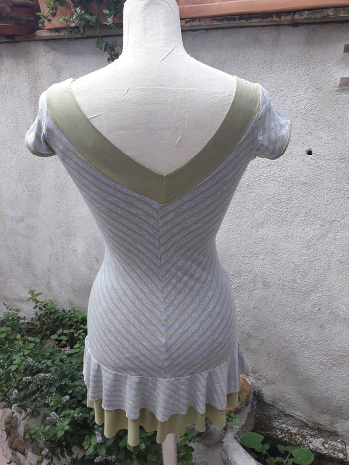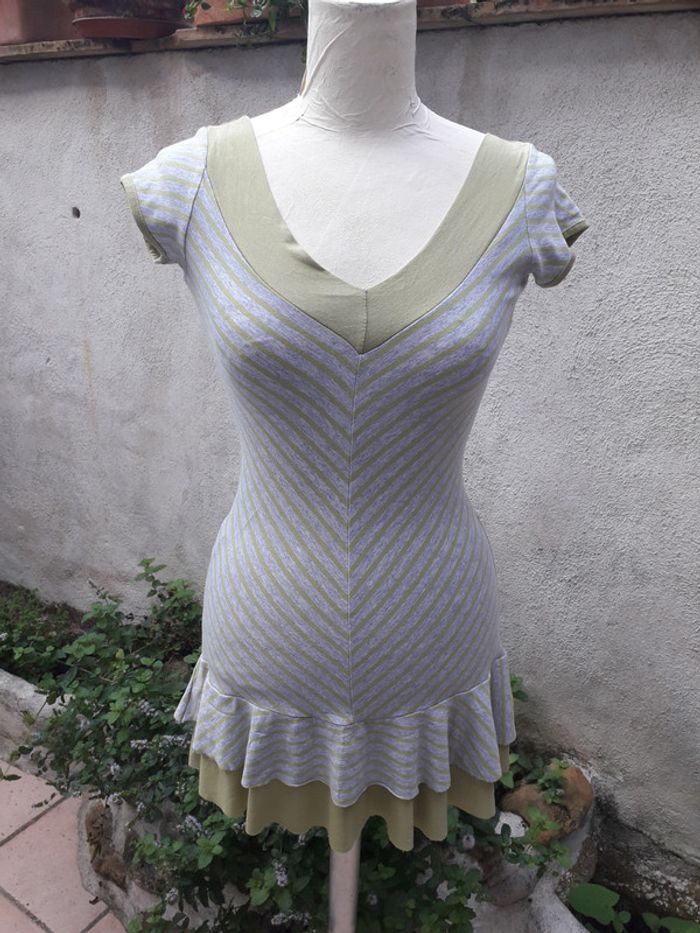 Robe tee-shirt d'été, 2 volants Encolure et dos en V 92% viscose - 8% élasthanne Portée mais très bon état Longueur de la pointe du décolleté au bas 59 cm Made in France. Taille 36/38 #robetailleS