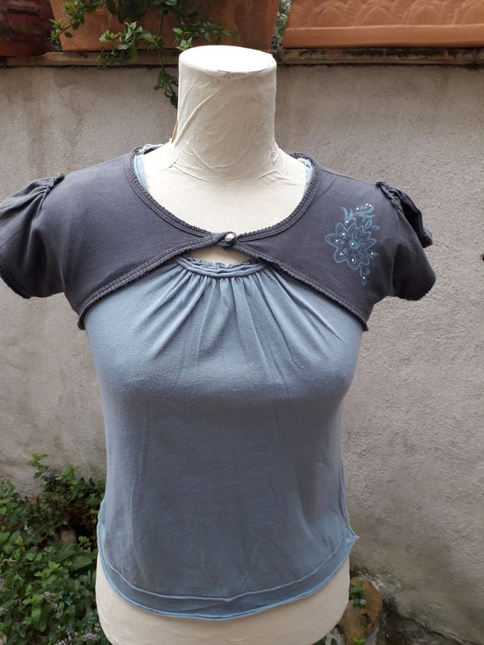 Ensemble 2 pièces : tee-shirt et boléro 100% coton Porté mais bon état Taille mais correspond à un XS