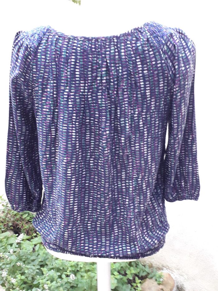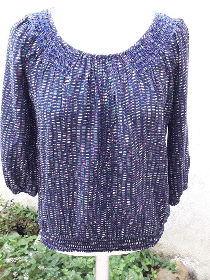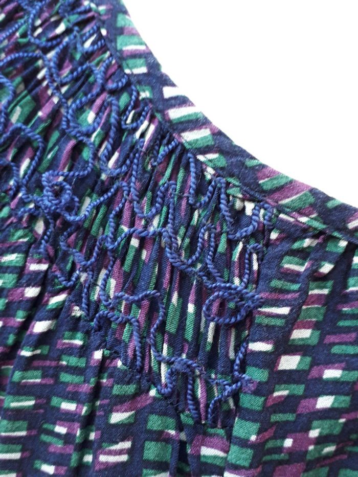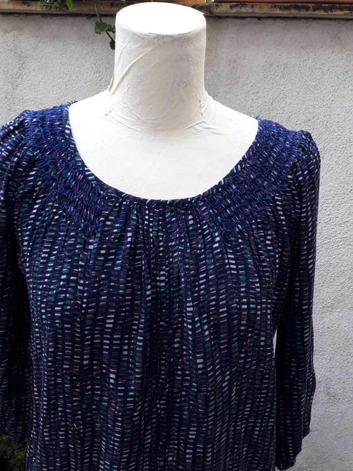Tunique manches 3/4 coton léger Encolure rond broderies et smocks Smocks au bas Fond marine avec petis motifs géométriques violets - verts - blancs Broderies encolures un peu sur une partie devant (dernière photo)