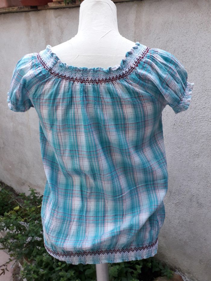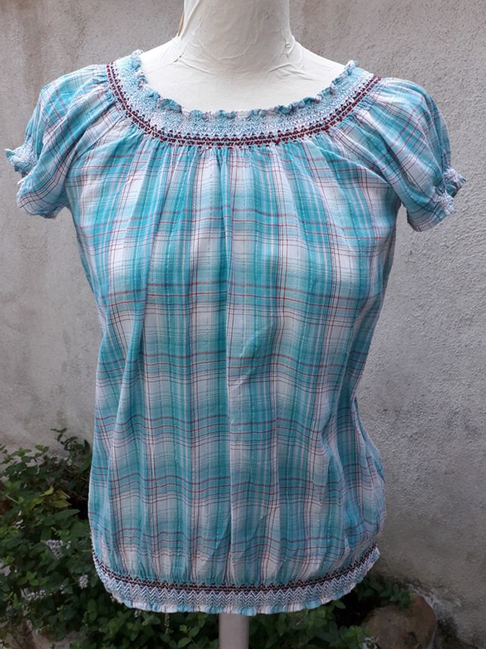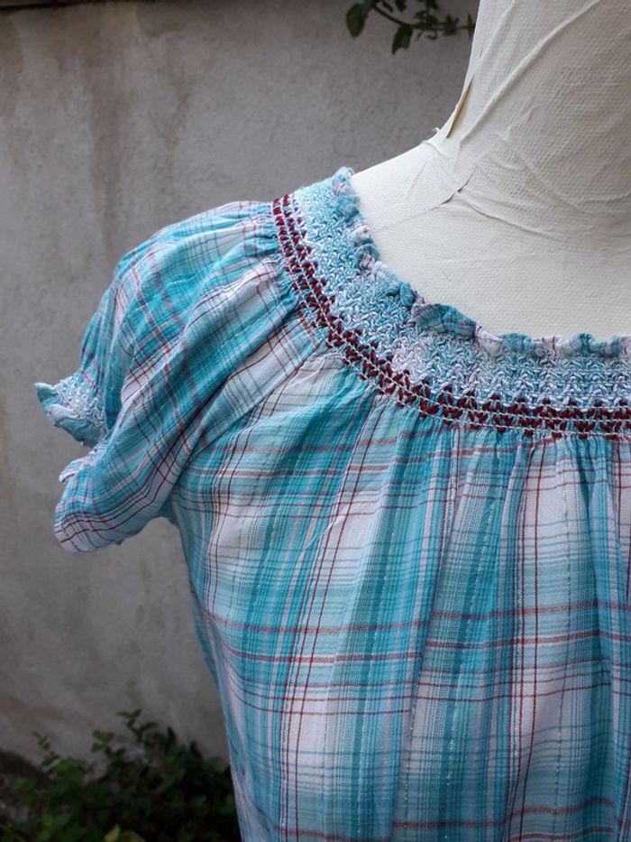 Tunique à carreaux turquoises et blancs Smocks à l'encolure, manches et bas Coton
