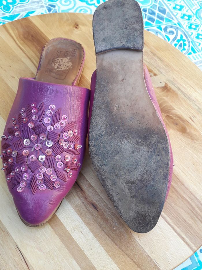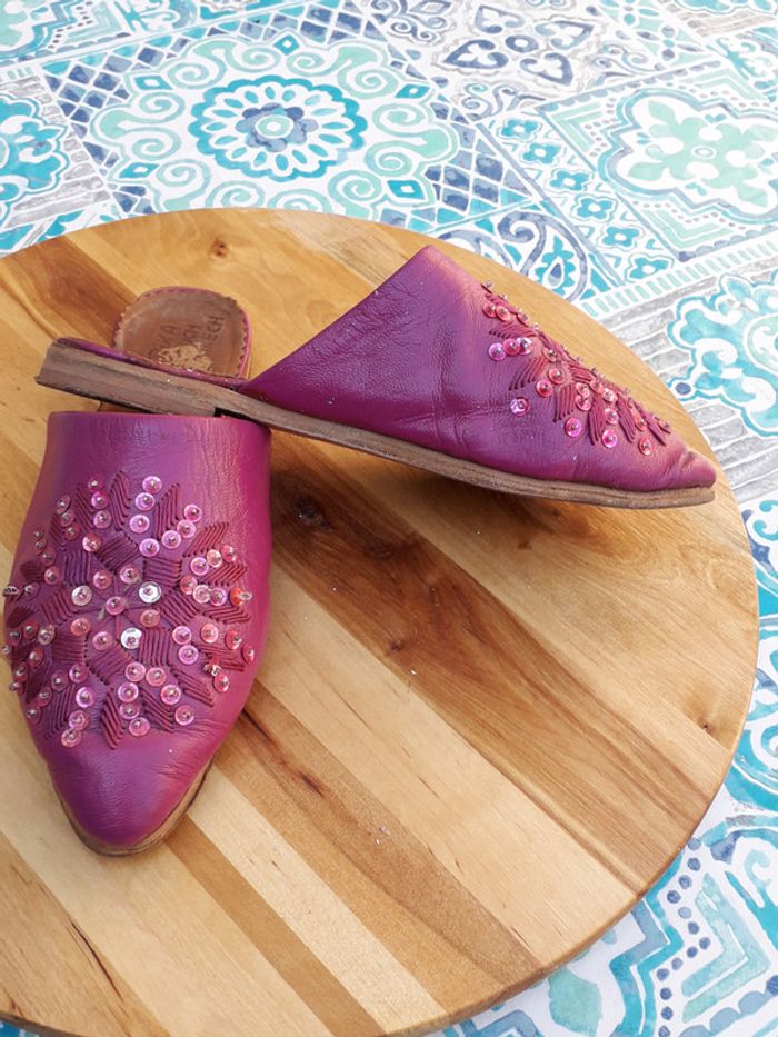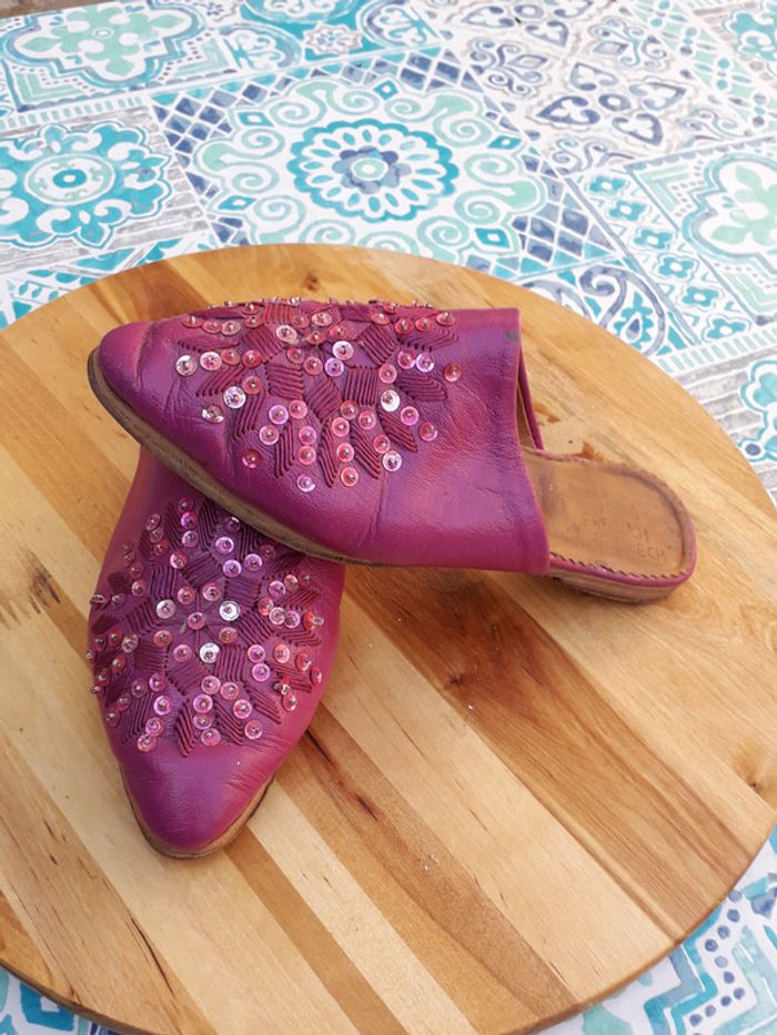 Babouches tout cuir rose Broderies et sequins sur le dessus Achetées chez un artisan de Marrakech Peu portées en bon état