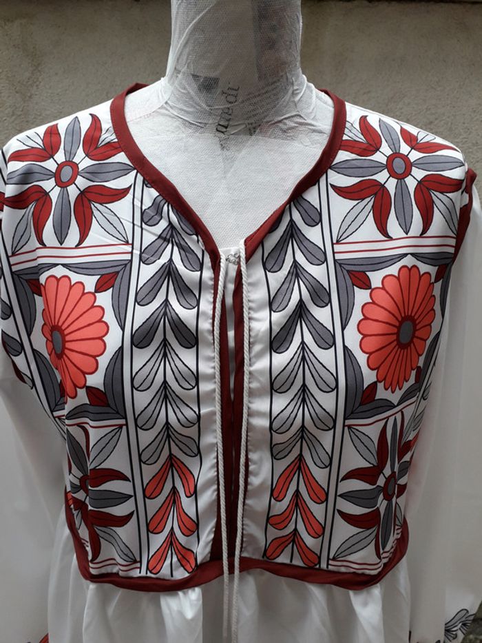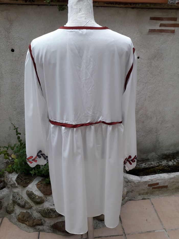 Robe bohème impression sur la poitrine et manches 2 cordons pompon - Elastique aux manches 100% polyester Fermeture par agrafes sur la poitrine Du décolleté au bas de la robe 79 cm de longueur Du dessous empiècement poitrine au bas de la robe 55 cm