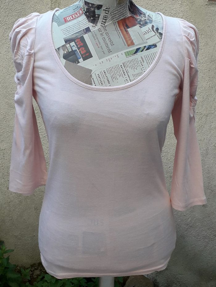 Tee-shirt manches 1/2 à effet bouffant sur épaules rose pâle - photo numéro 1