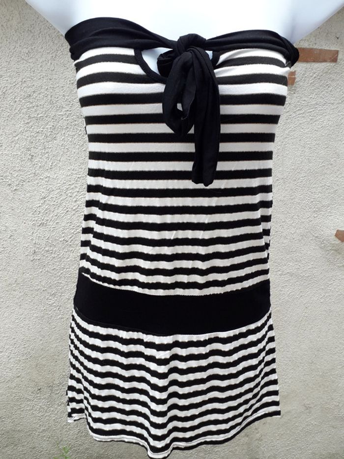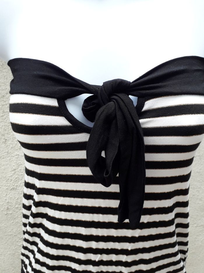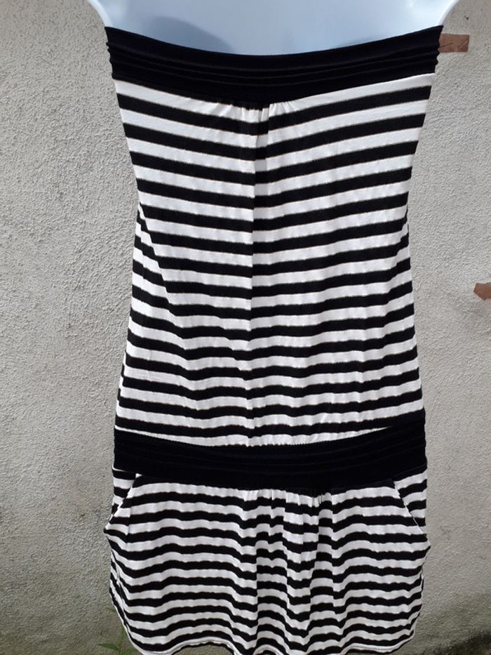 Robe bustier marinière. Rayures noires et blanches et fils or 2 poches à l'arrière 94% viscose 6% élasthanne
