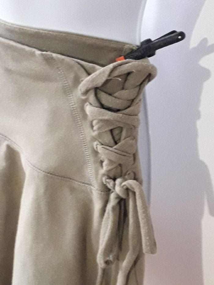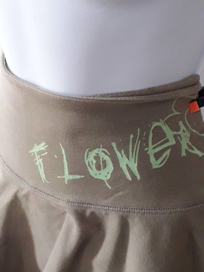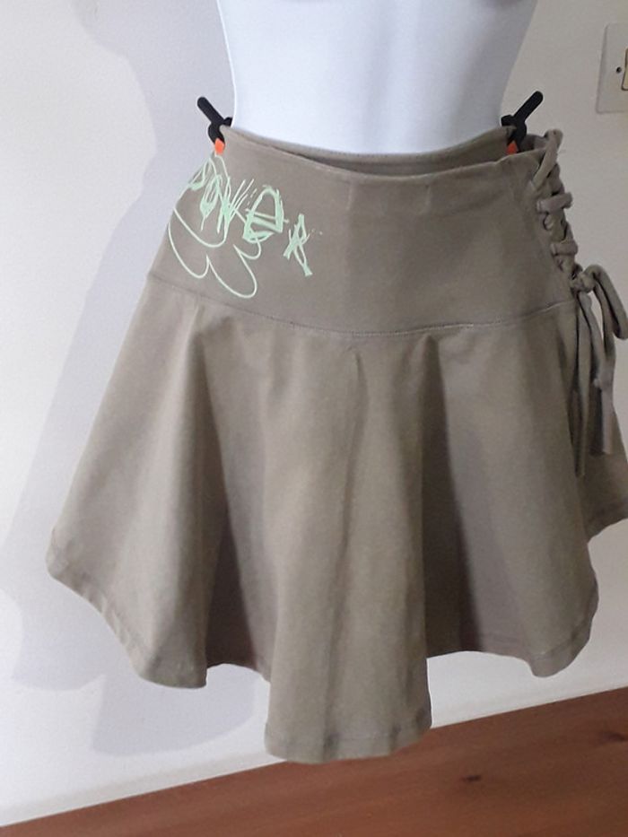 Jupe patineuse kaki Large ceinture, plus longue derrière que devant, sérigraphie sur le côté gauche, lacet sur le côté droit. Coton