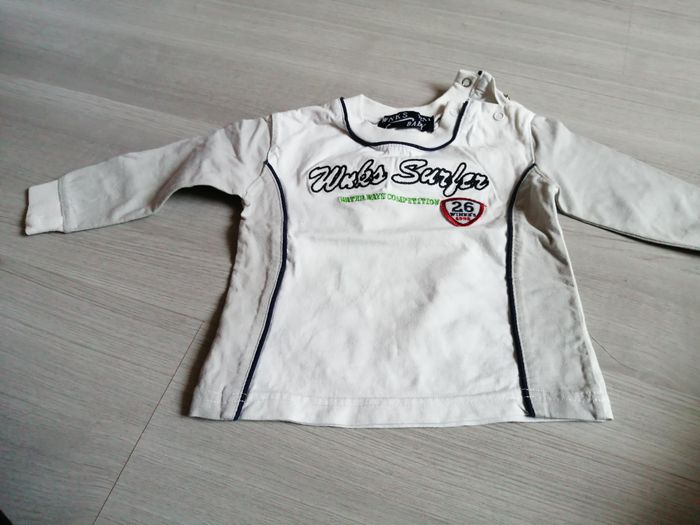 Je vends un tee shirts manches longues blanc et gris , taille 12 mois. Très bon état. Maison non fumeur. Envoi rapide et soigné.