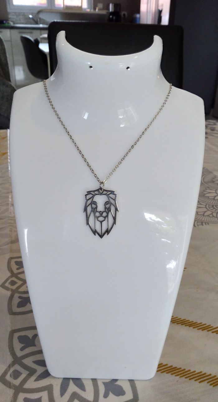 Chaine coloris argenté de 42 cms. Pendentif lion origami : 2.7x1.8 cms. Collier sous blister. Envoi rapide et soigné.