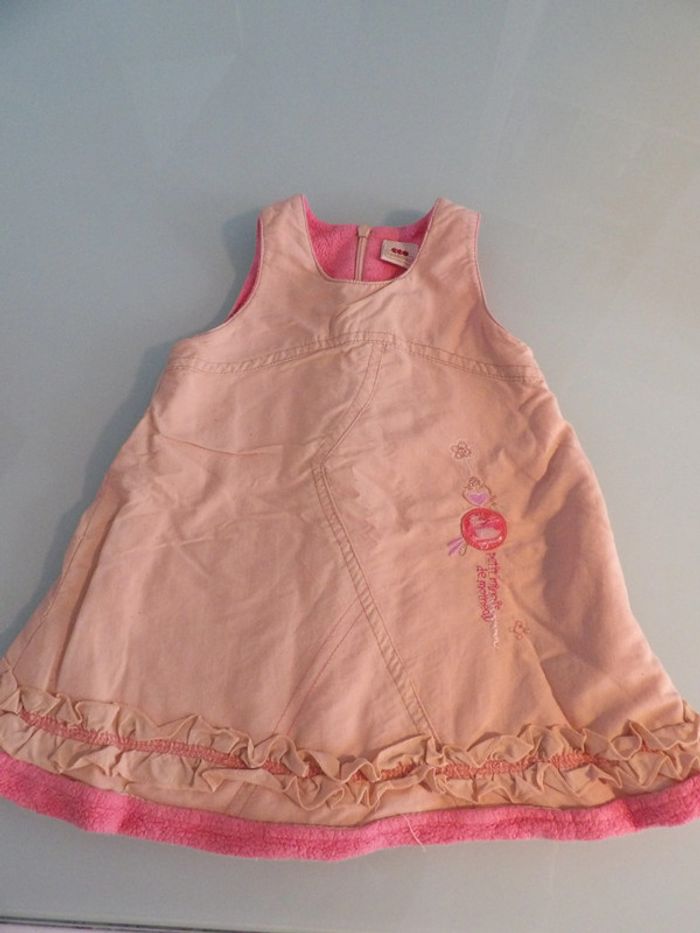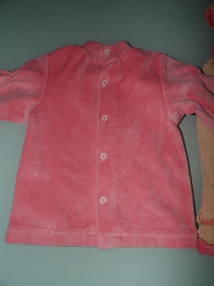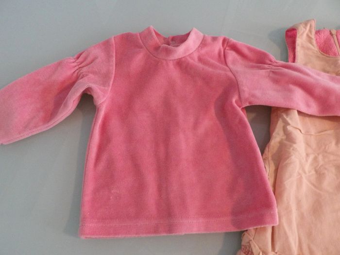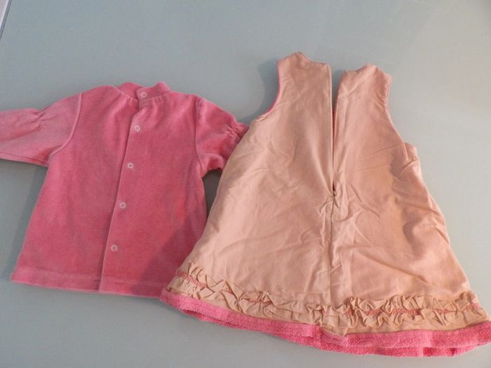 Ensemble robe doublée polaire+ Pull velours tout doux Marque : 3 pommes Robe Couleur Saumon doublée rose " petit minois" Ouverture par fermeture éclair dans le dos + Pull velours en manches longues ouverture arrière par boutons pression #mbuzziesixmois #mbuzzieensemble #ensemblehiver6moisfille #ensemble6moisvelours #3pommes