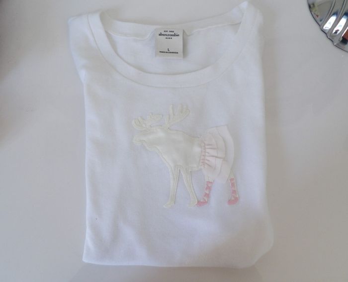 Tee shirt Blanc - Marque : Abercrombie kids - Taille : 15/16 ans logo avec tutu en tulle et ballerines [légère reprise sur la manche, se voit à peine. Voir dernière photo] #mbuzziequinzeans #mbuzzieseizeans #abercrombie #tshirtabercrombie15ans #tshirtfilleabercrombie15ans#tshirtabercrombie16ans #tshirtfilleabercrombie16ans #tshirttutu #tshirtballerines
