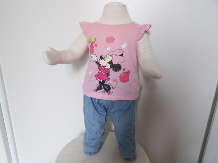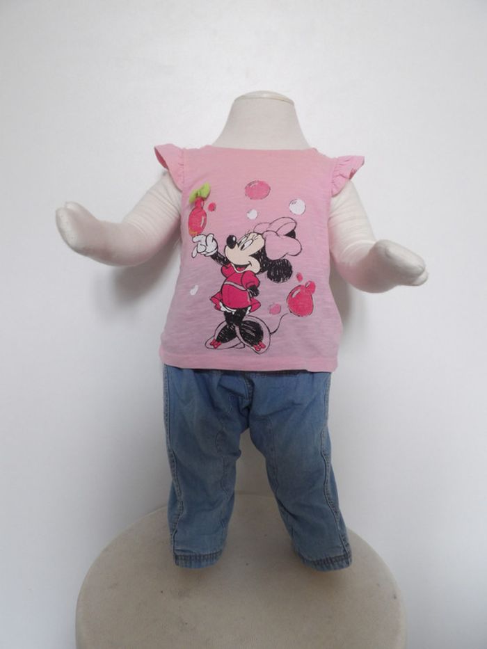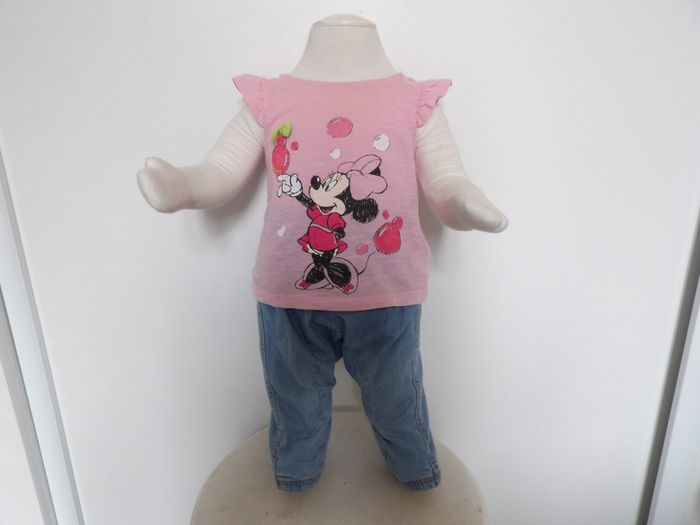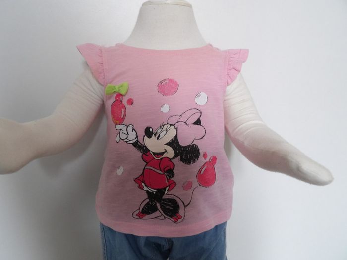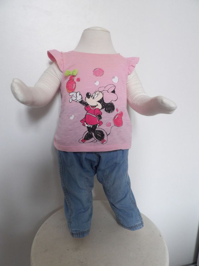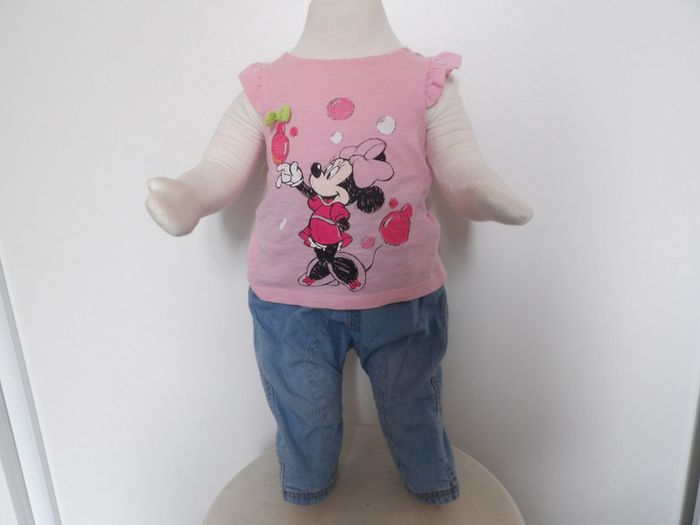 Tres joli ensemble fille 3 mois, comprend : - Tee shirt Minnie - Disney baby Très joli top rose Dentelle sur les épaules Petit nœud vert + Jeans clair fin - DPAM tres confortable poche sur le devant #mbuzzietroismois #dpam3mois #dpamjeans3mois #jeansfille3mois #teeshirtminnie3mois #disney #teeshirtroseminnie3mois #mbuzziedisney