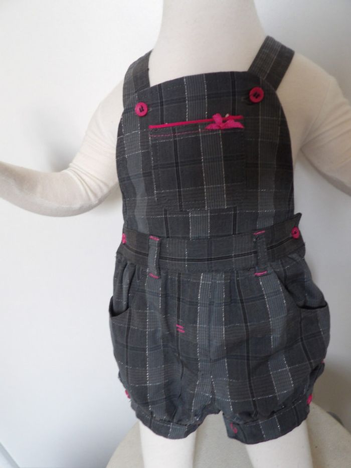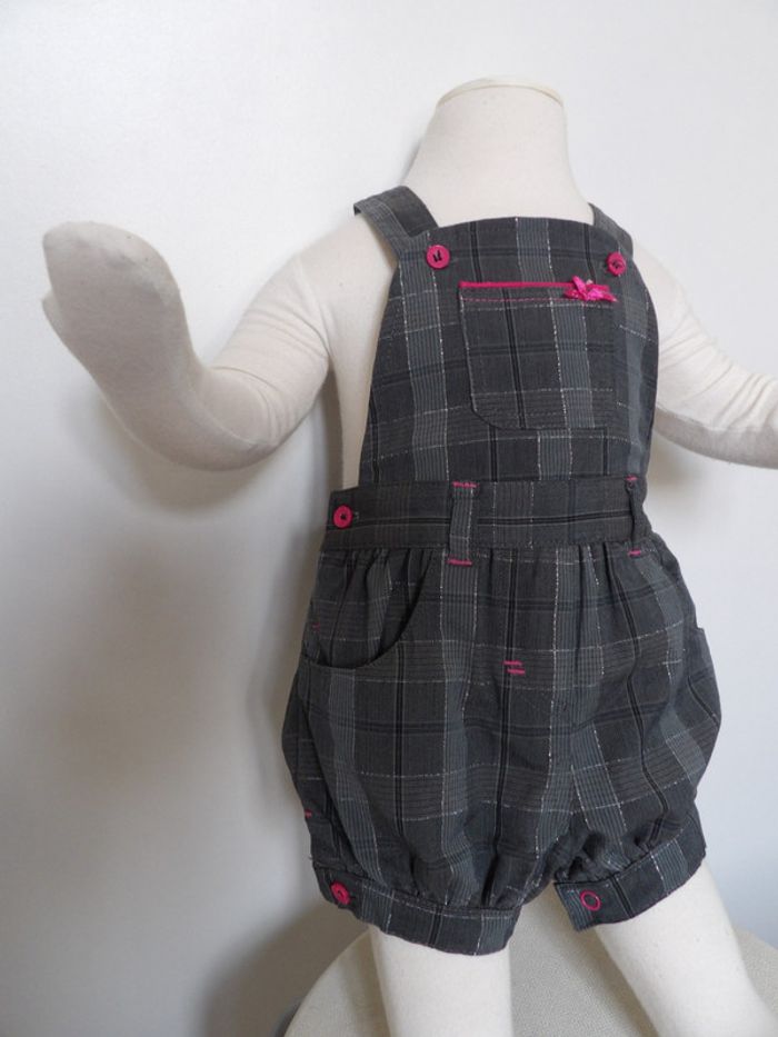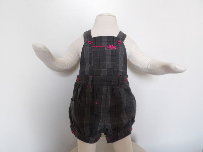 Salopette short à carreaux grise et touche de rose - Marque : Orchestra. - Liseré argenté entre les carreaux. - Bretelles croisées dans le dos. - 2 tailles de pressions aux épaules. - Taille : 6 mois (67 cm) #mbuzziesixmois #salopetteshort6mois #barboteuse6mois #orchestrafille6mois #salopetteorchestra6mois