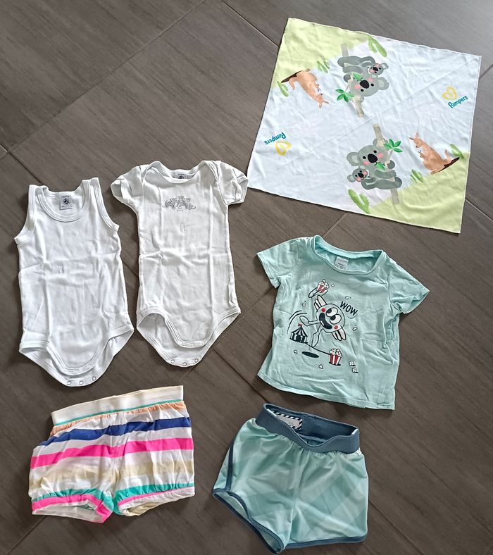 🚨Lot indissociable ⛔ 81 cm Ce lot est composé de : - 1 bodie débardeur Petit Bateau ⛵ - 1 bodie manches courtes Petit Bateau ⛵ - 1 short à rayures multicolores - 1 ensemble short et tee-shirt Décathlon - 1 carré bavoir / bandana ou doudou Pampers #18moisfillecamilled974