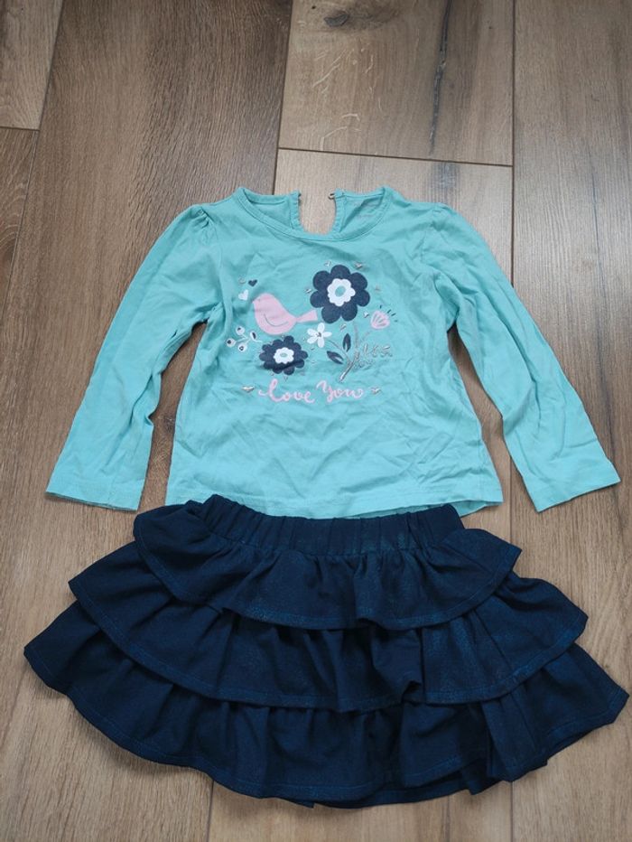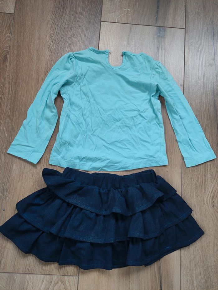 Ensemble 3 ans. Tee shirt turquoise et jupe bleu marine pailletée. Haut marque pat et ripaton. Bas marque miss liberto Très bon état #severine1003_enfant_fille_3ans